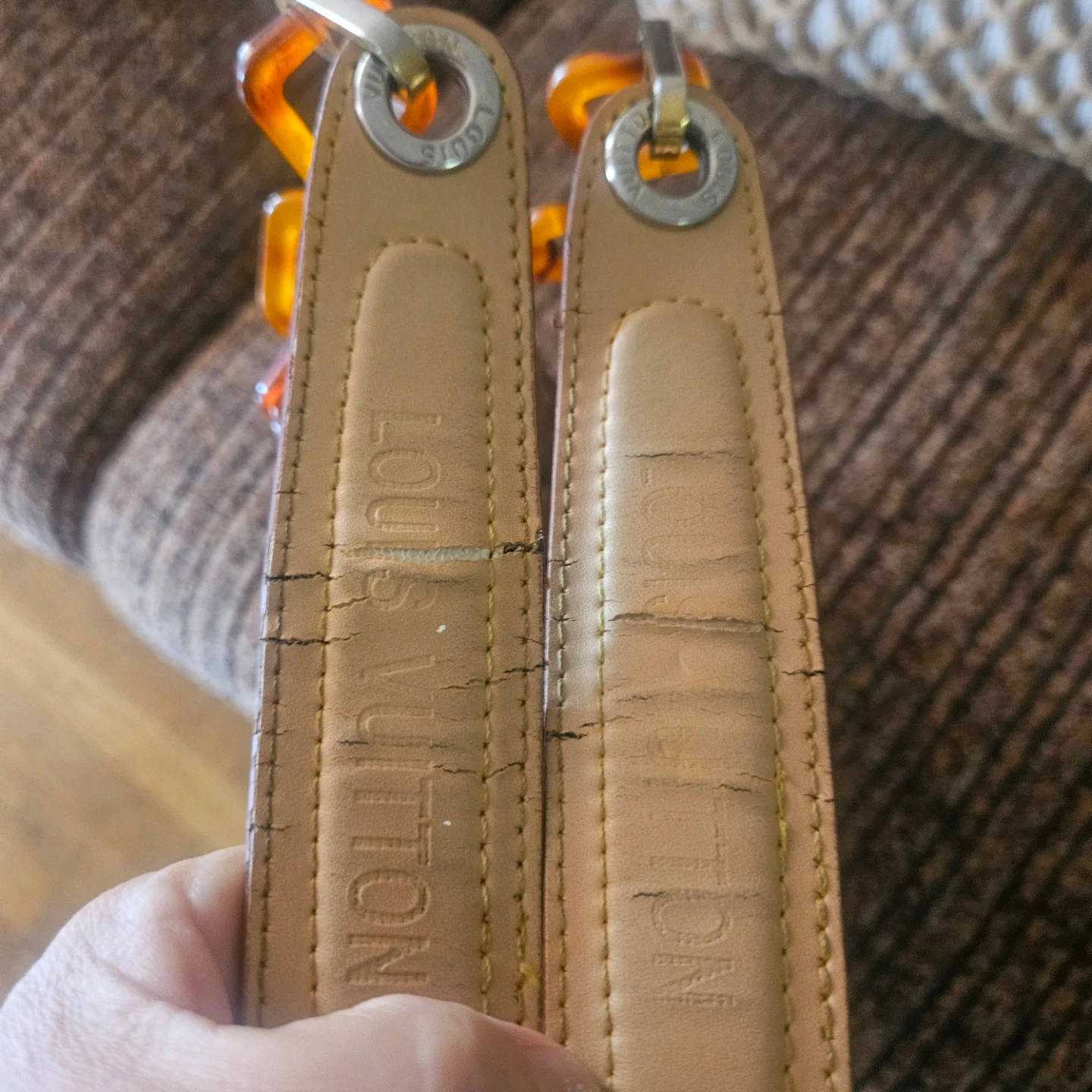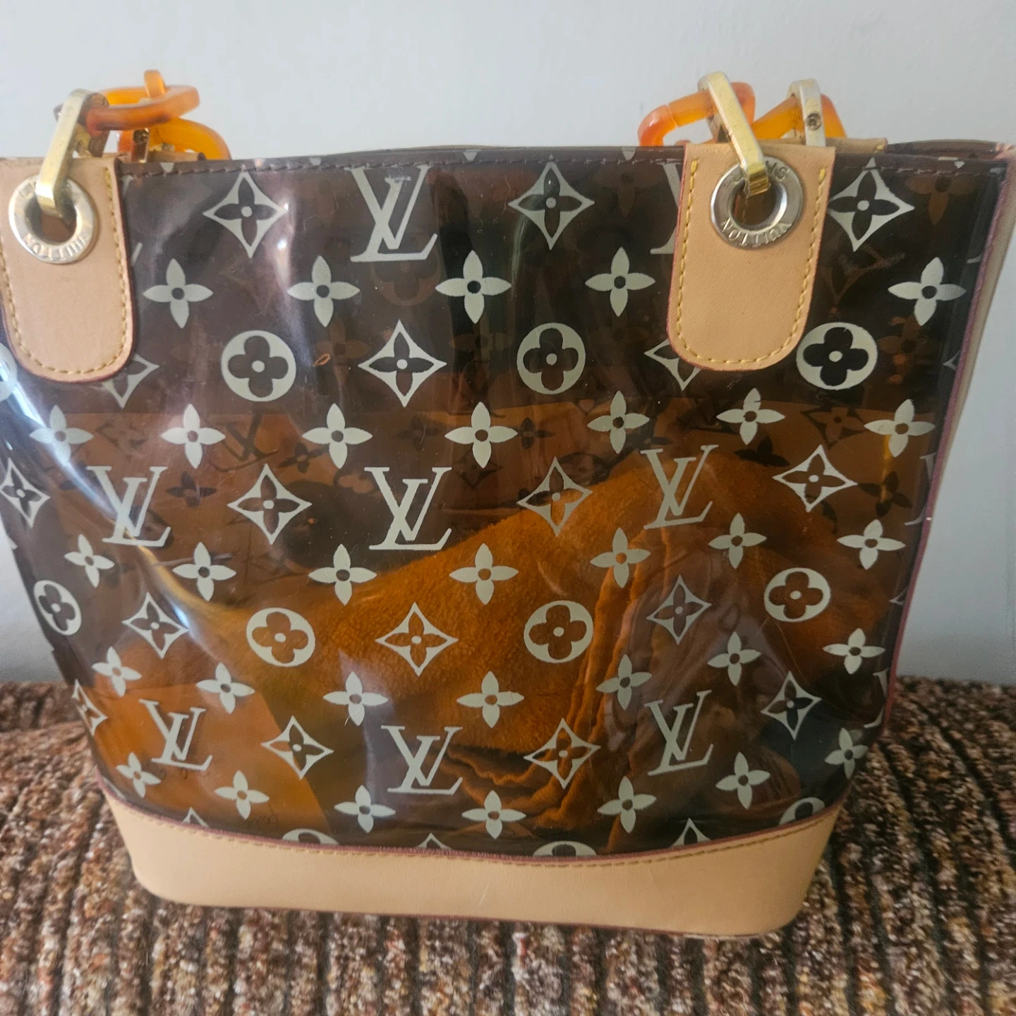 This Louis Vuitton tote bag features the iconic monogram pattern on a transparent PVC exterior. It has tan leather trim and tortoise shell style handles. Includes protective metal feet on the bottom.100% authentic hi