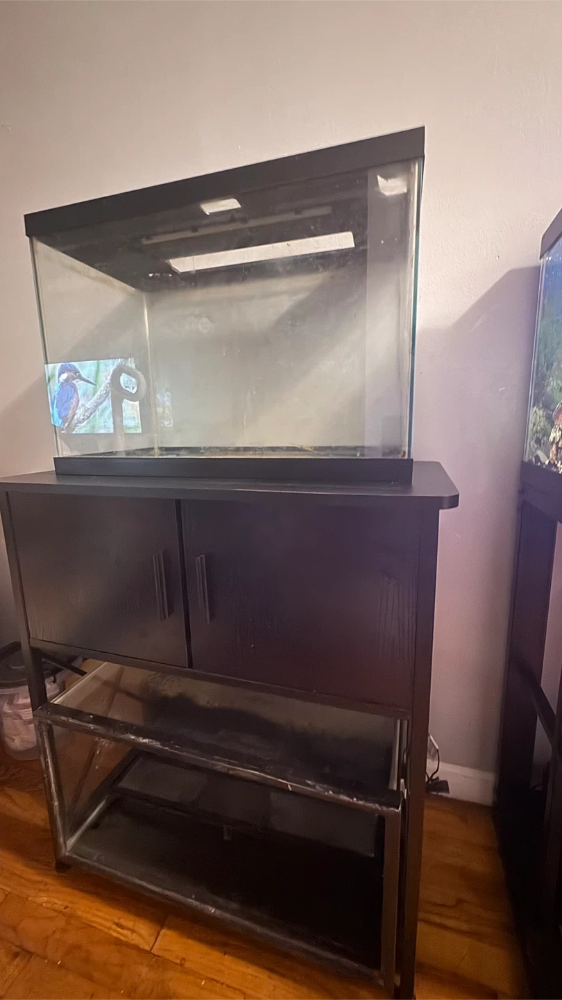 This is a glass aquarium tank and stand. It's a great setup for fish or other small aquatic pets. The tank is made of glass with a black plastic lid.