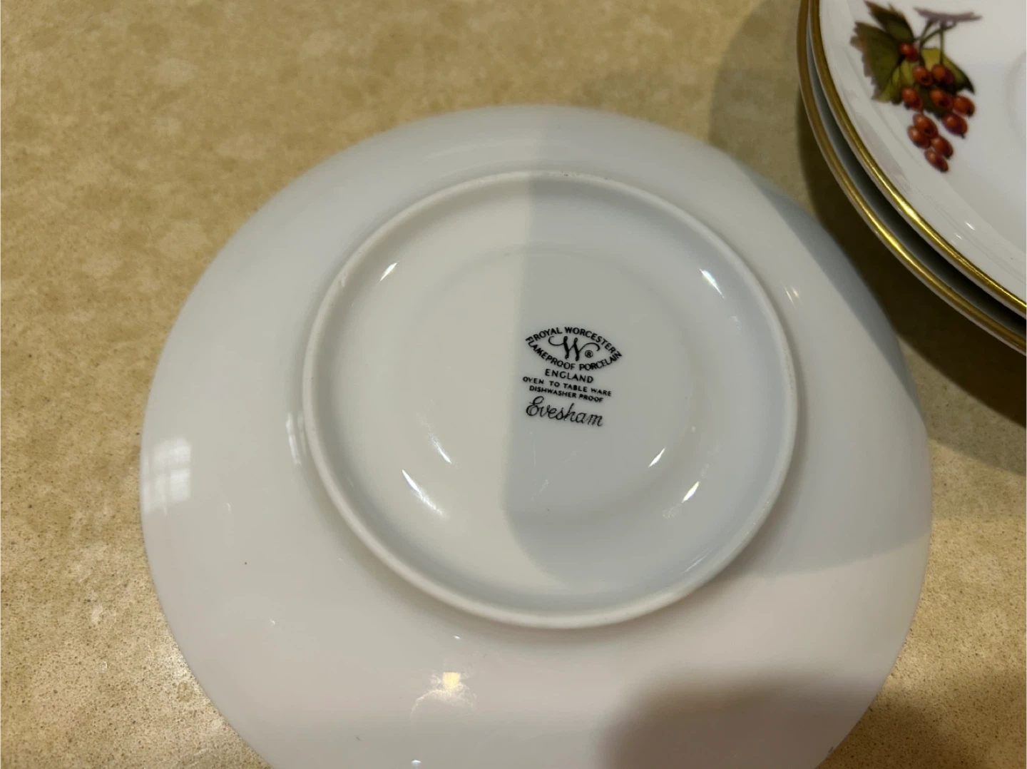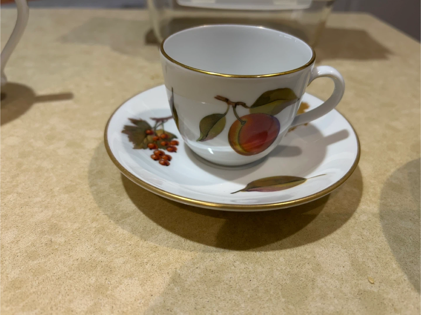 of teacups and saucers featuring fruit and berry designs. Porcelain with gold trim. Dishwasher safe and oven to table ware.