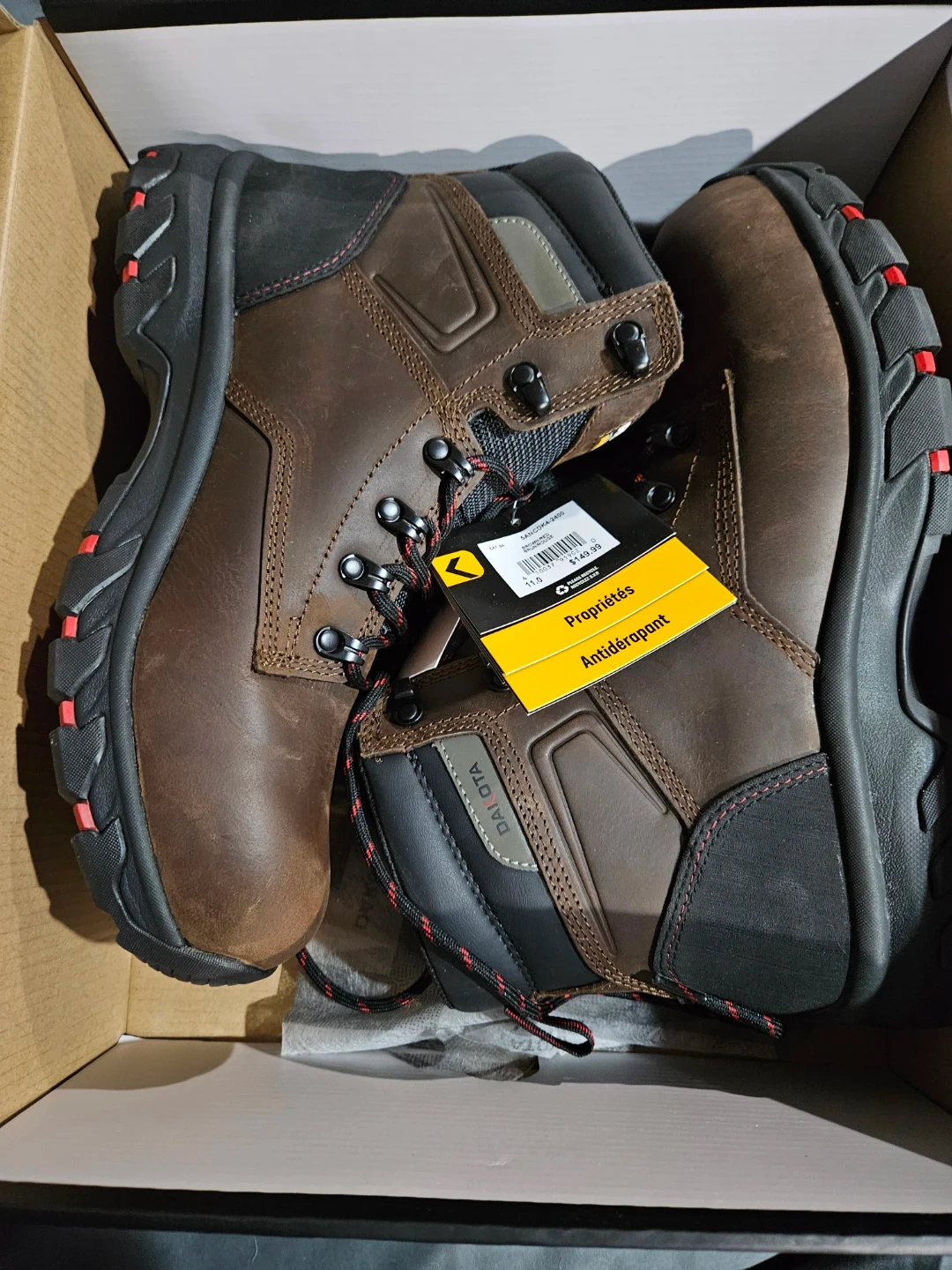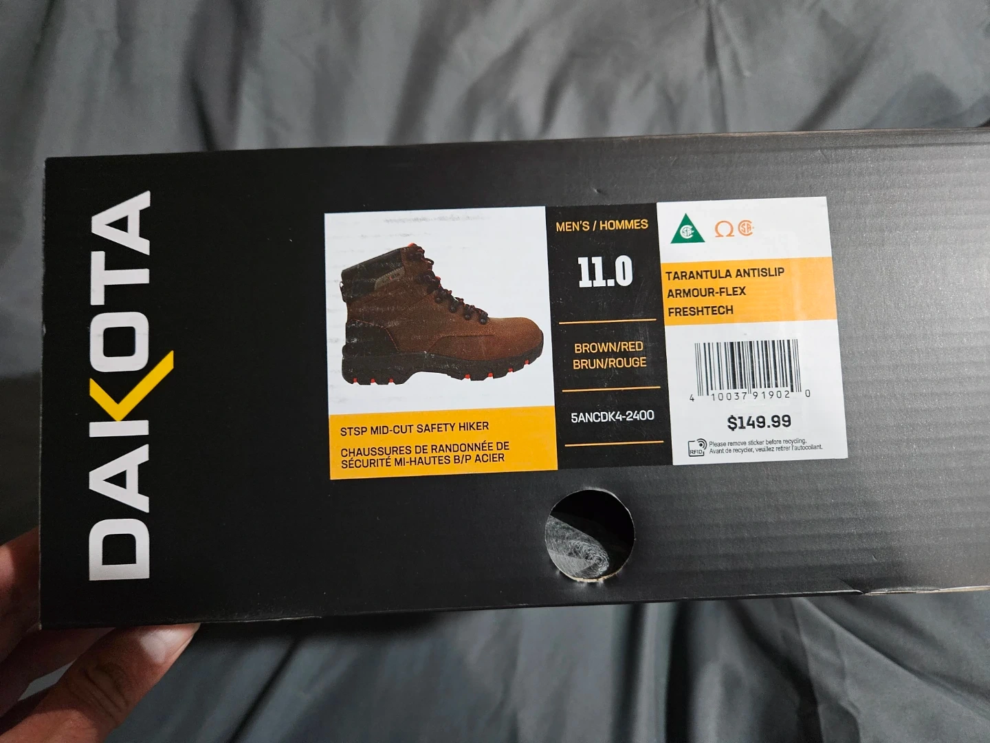 These are Dakota WorkPro Series Men's 6-inch work boots. They're a mid-cut style with a steel toe and composite plate. The boots are also slip-resistant with armour-flex and fresh-tech.
