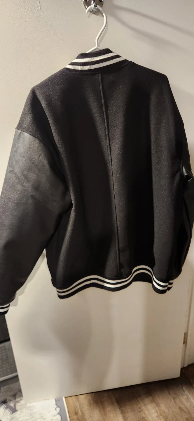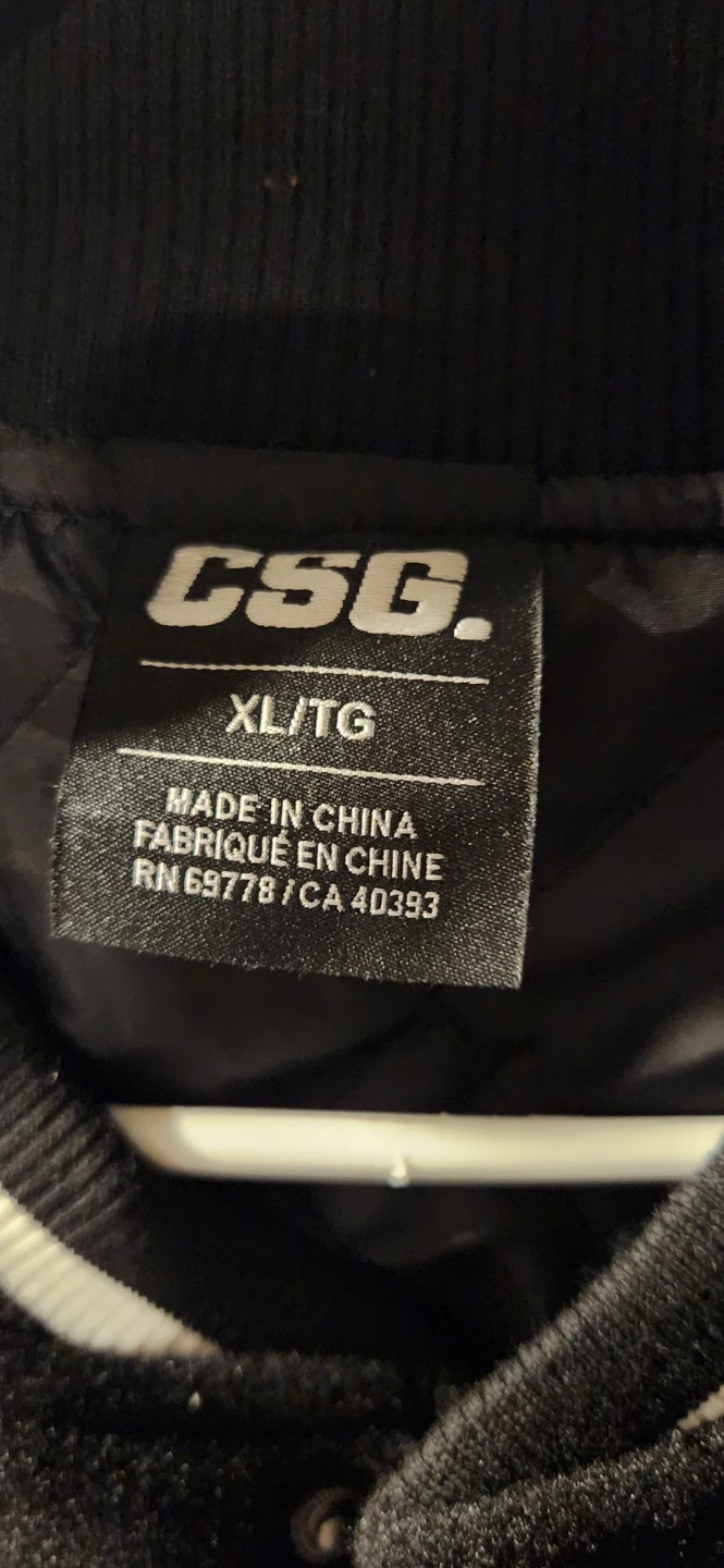 This is a black CSG varsity jacket in size XL/TG. It features faux leather sleeves and a snap button closure. The ribbed collar, cuffs, and hem have white stripe detailing. Brand new without the tags.