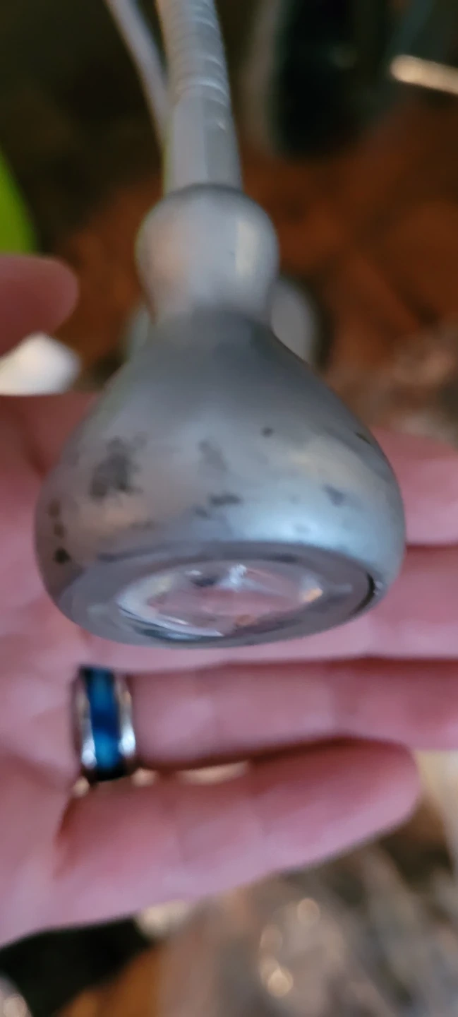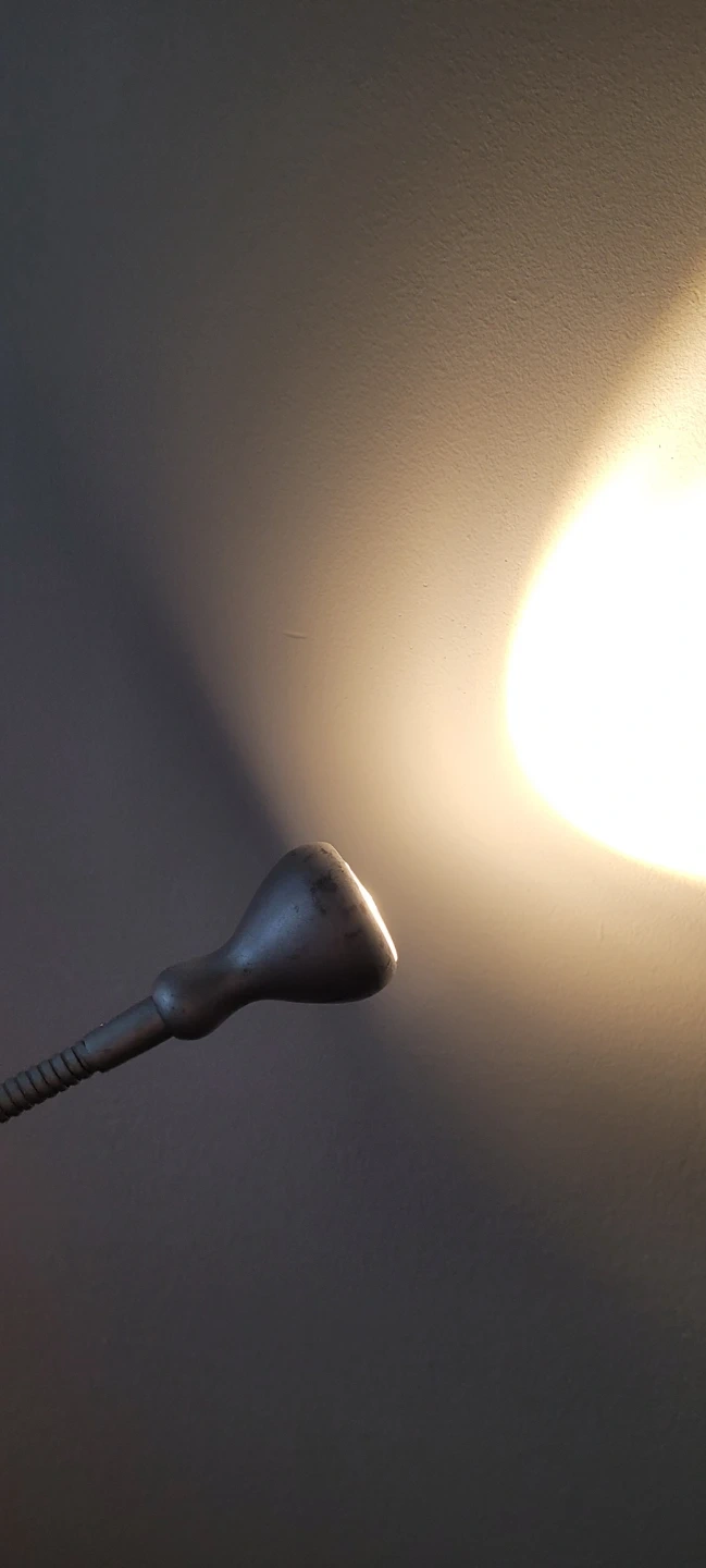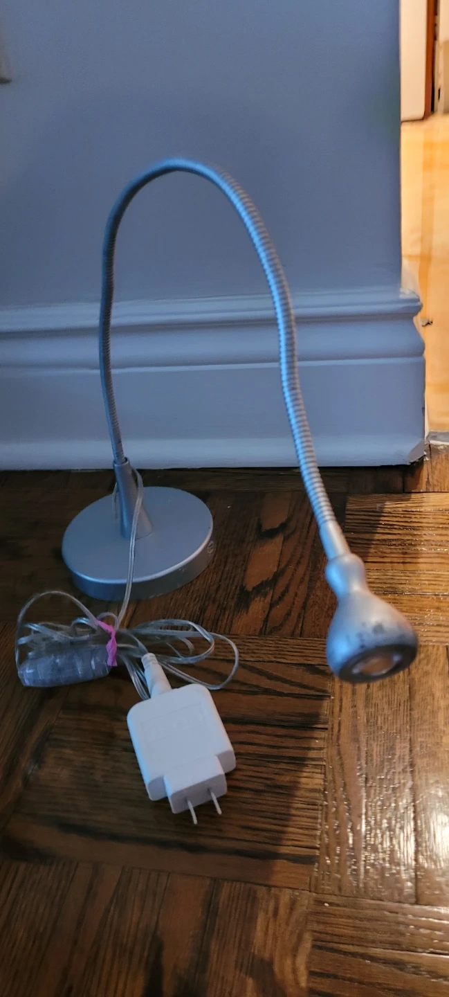 This is an IKEA adjustable desk lamp. It's silver with a flexible neck and includes the power adapter.