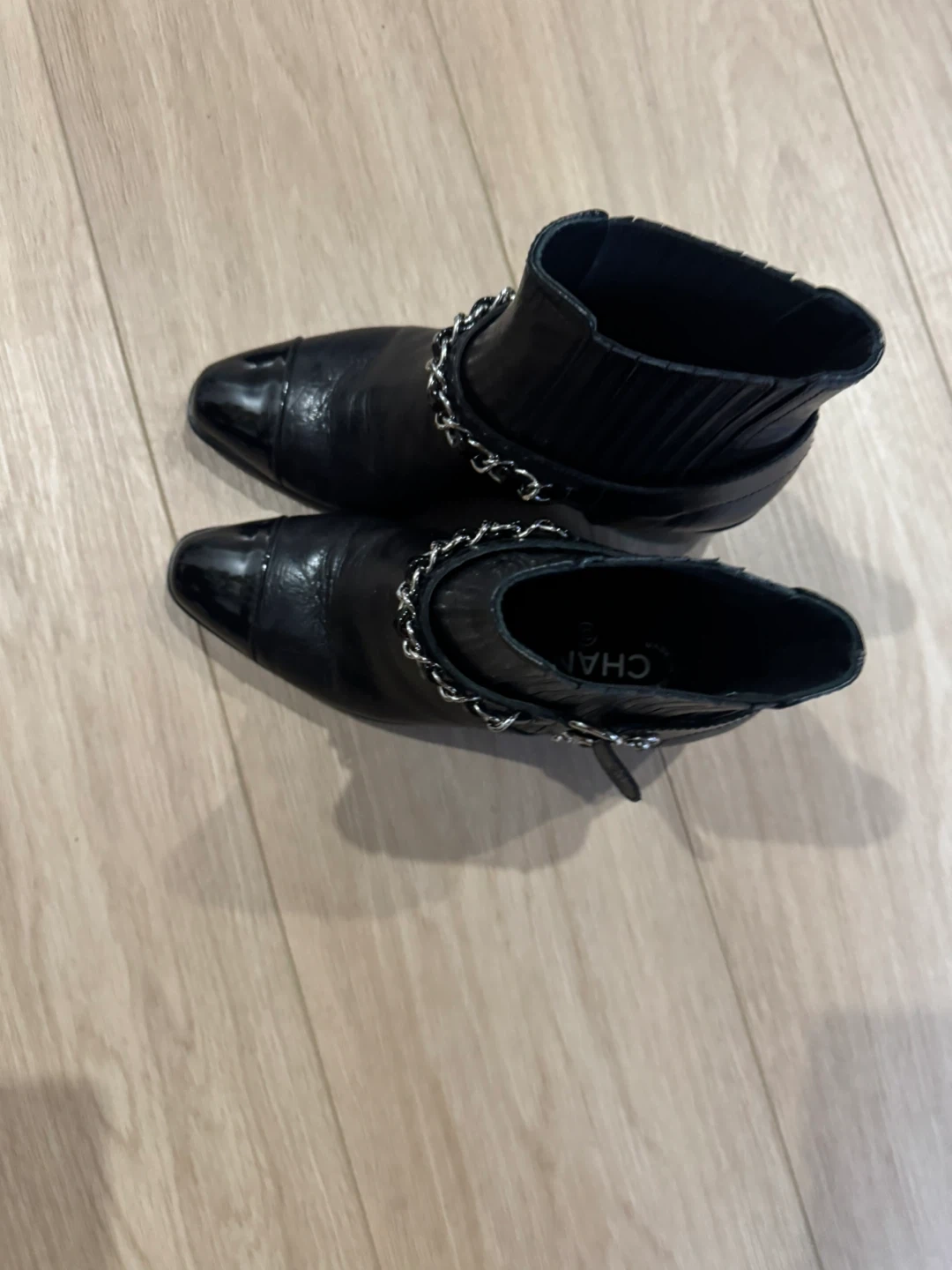 These are black leather ankle boots from Chanel. They feature a decorative chain detail around the ankle with a small Chanel logo charm. The boots have a pointed toe with a patent finish and elasticated side panels for easy wear. Heel height appears to be medium.