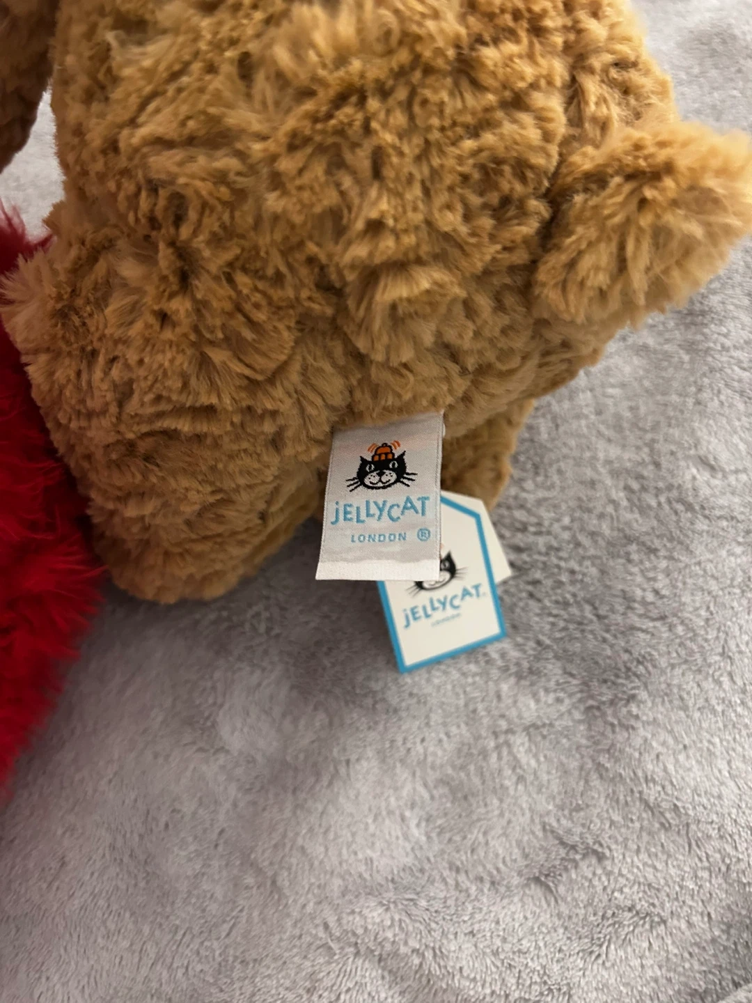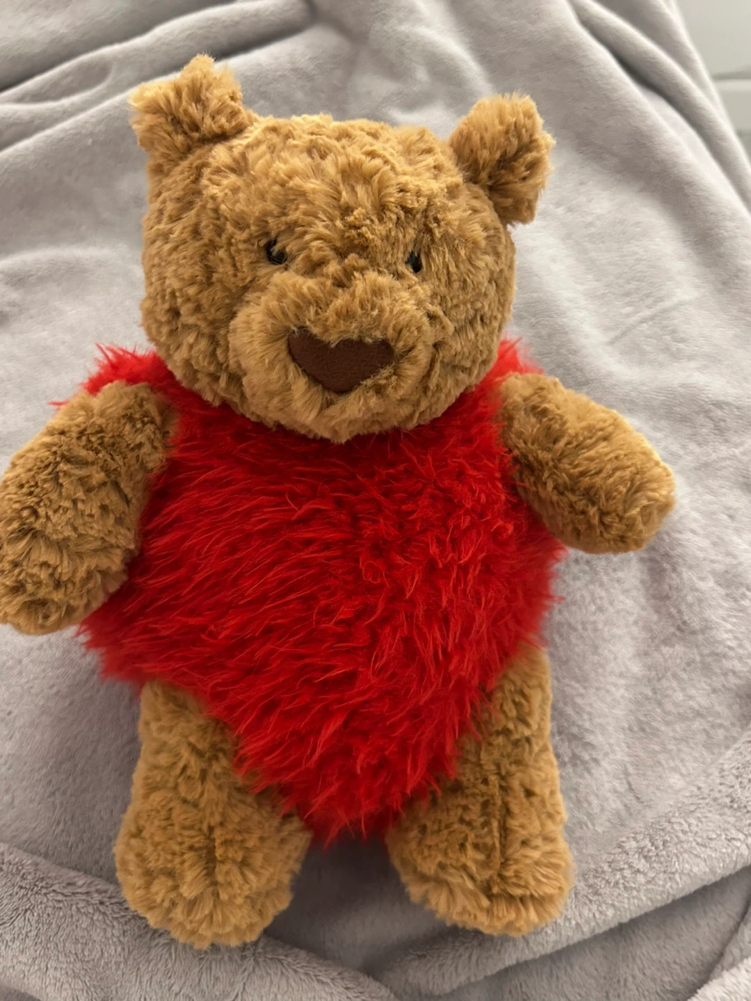 Selling a super cute Jellycat London brown bear plush toy! It's ready for a new home. This cuddly bear has a red fluffy heart on its chest. Perfect for gifts or collectors!