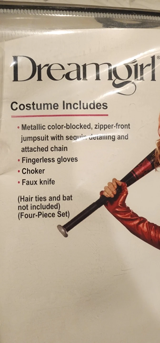 Dreamgirl "Harlequin" (four-piece) costume set, includes: a metallic color-blocked, zipper-front jumpsuit with sequin detailing and an attached chain, fingerless gloves, a choker, and a faux knife.