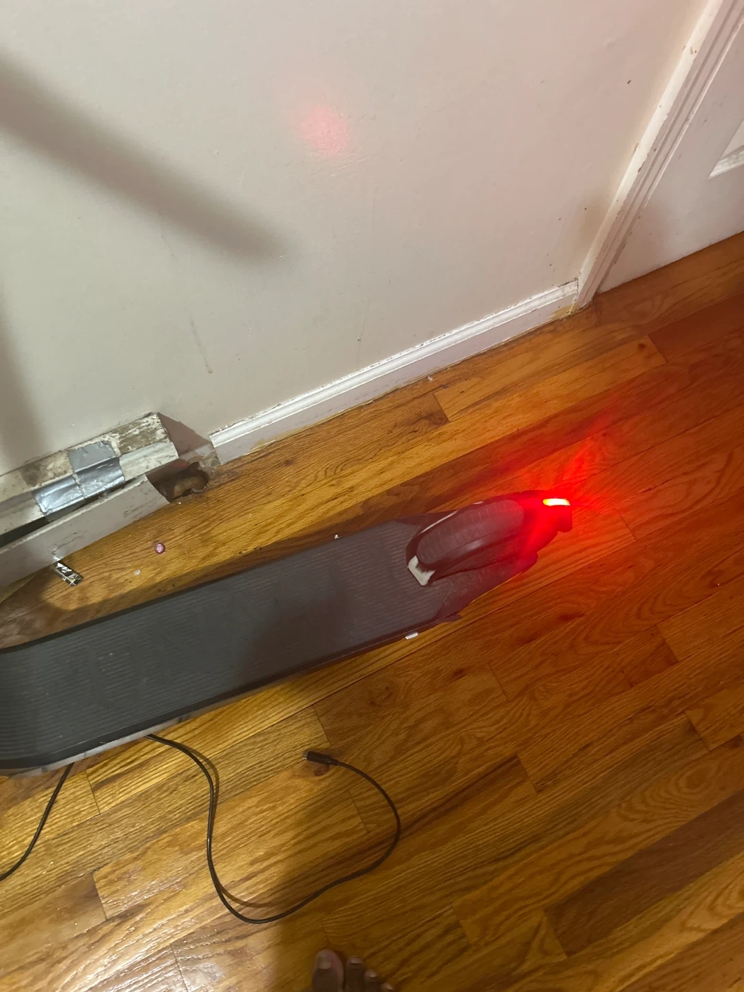 This electric scooter is black with a digital display showing speed and battery life. It comes with its original charger. The scooter has a bright red tail light for visibility. Ready for your commute!