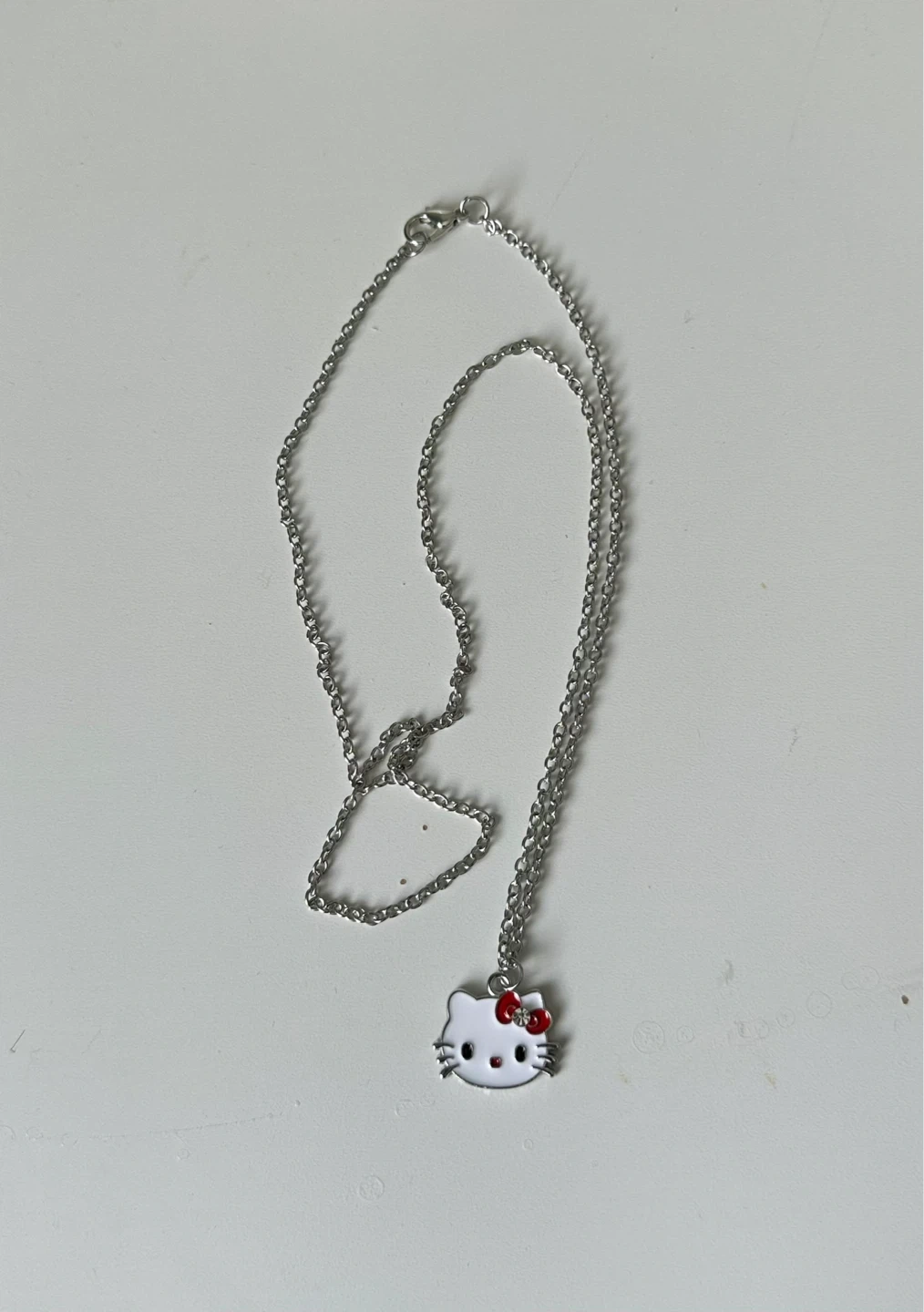A cute Hello Kitty pendant necklace with a silver-tone chain. Features the iconic Hello Kitty face with a red bow accent. Perfect for any fan!