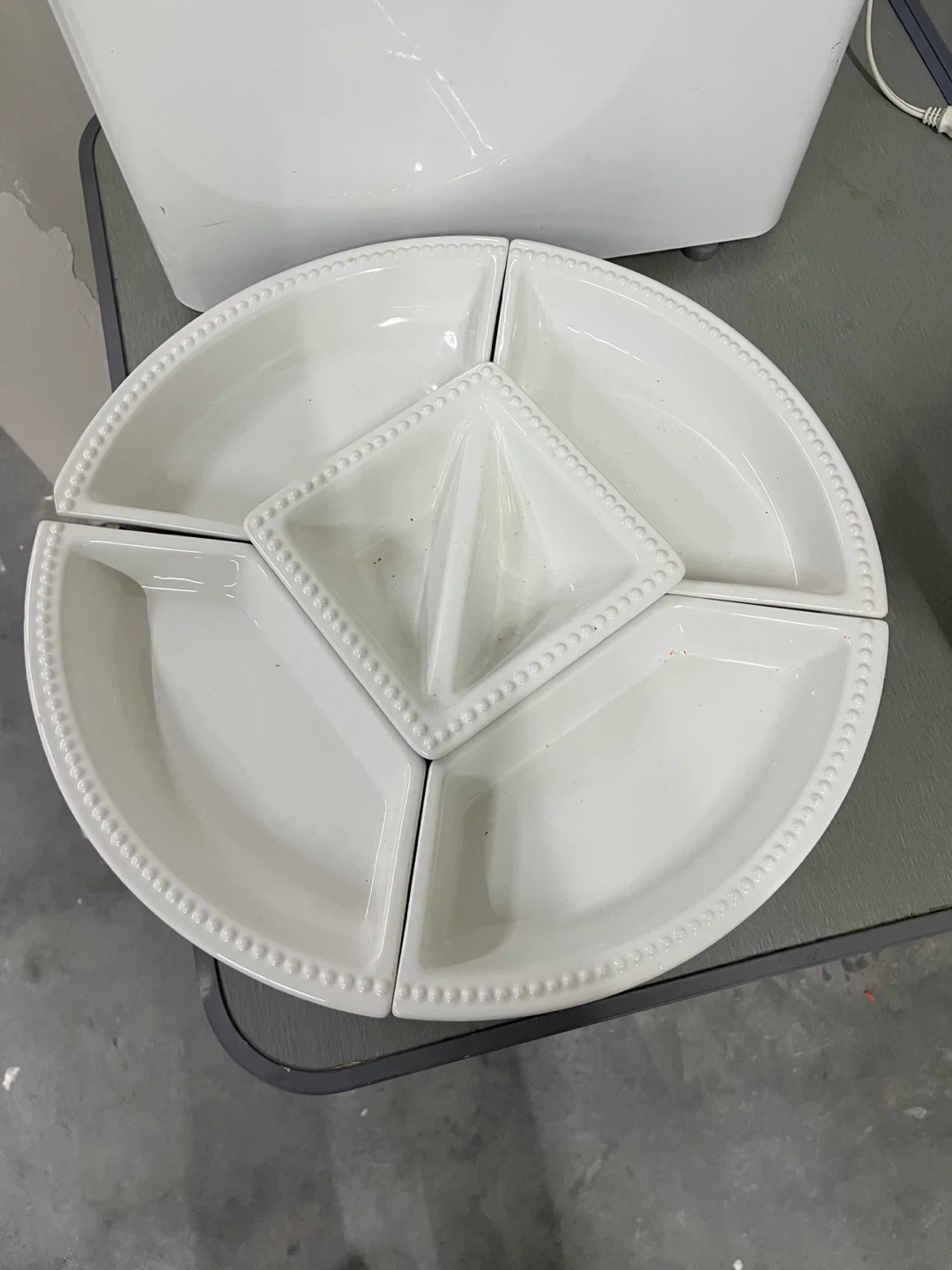 Selling a Certified International divided serving dish. It's a great way to serve snacks or appetizers. The dish is white and has a beaded design around the edges. It's in good condition and ready for a new home