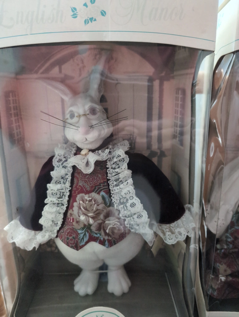 White rabbit with glasses wearing a velvet jacket, a lace shirt and a floral vest. Comes with a display stand.