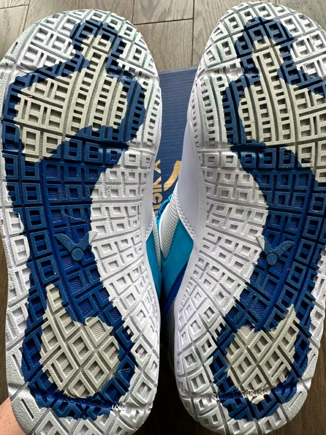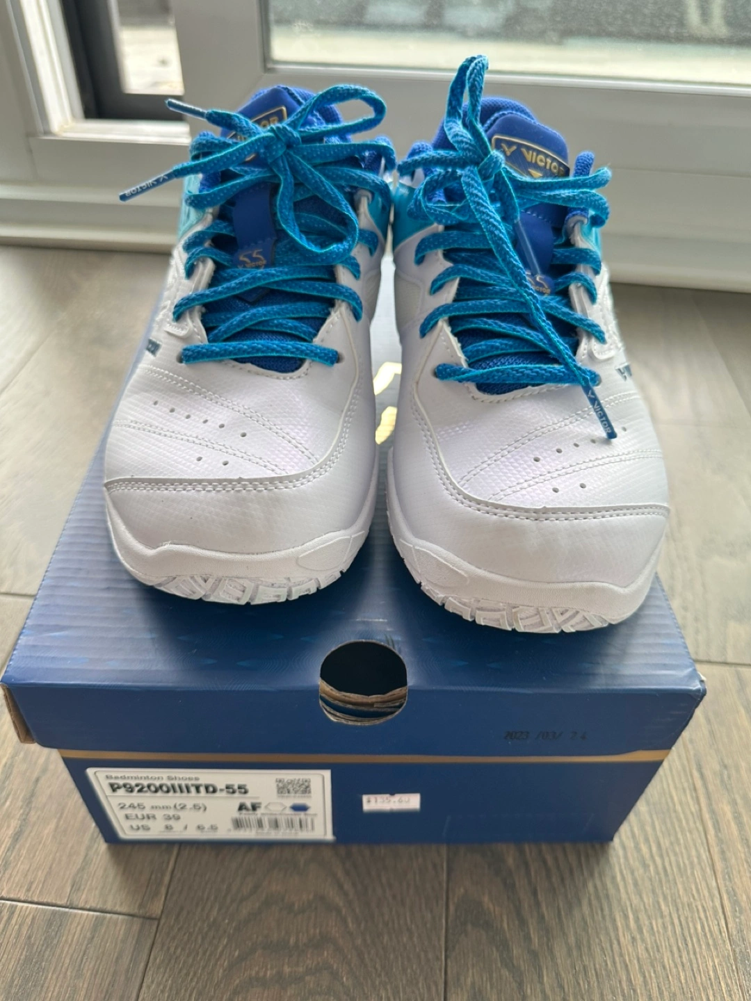 Lightly used Victor badminton shoes. Size EUR 39. White with blue accents. Great condition. Includes original box.