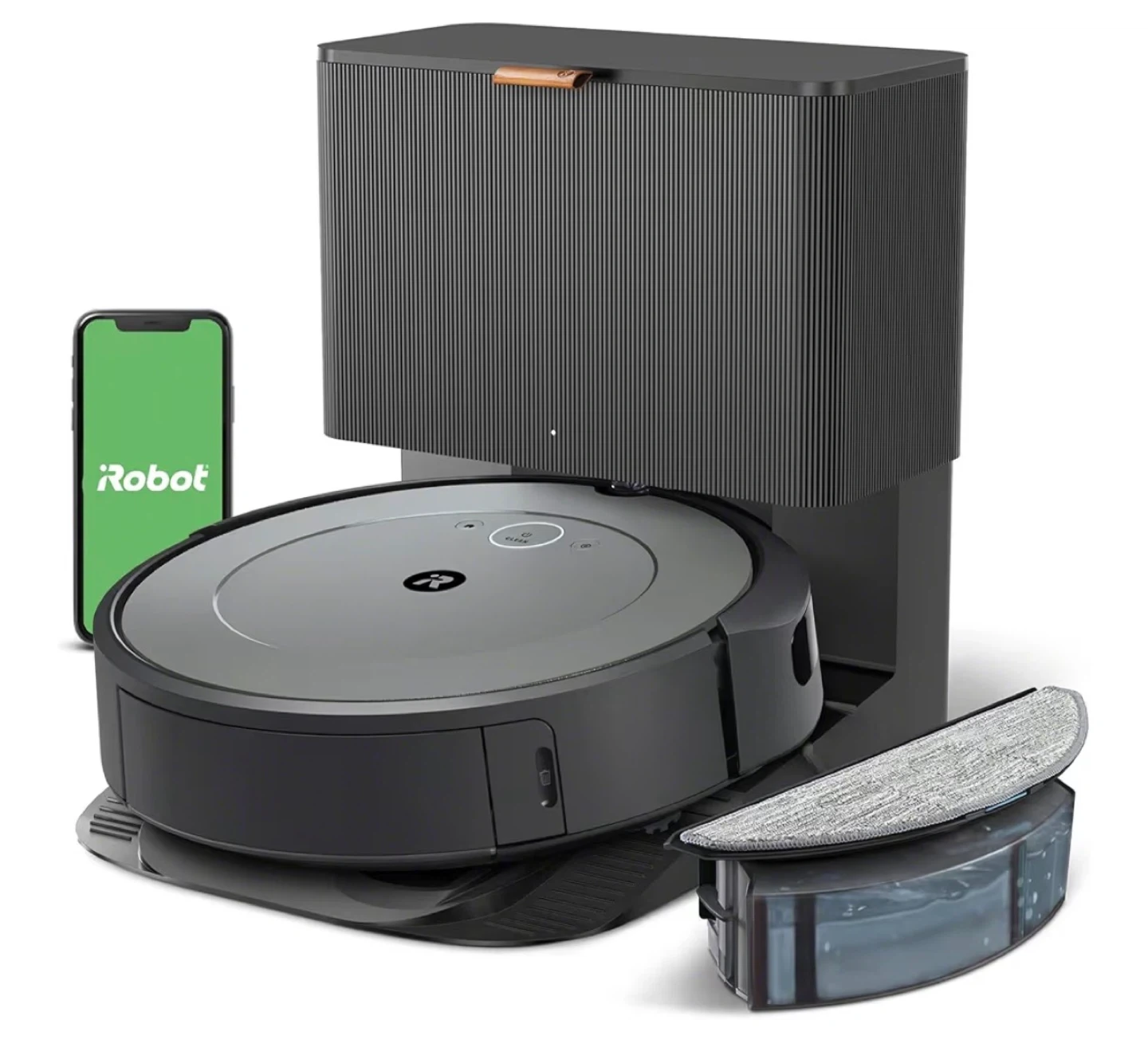 This iRobot Roomba Combo i3+ robot vacuums and mops your floors. It automatically empties itself, and it's controlled with the iRobot Home app.