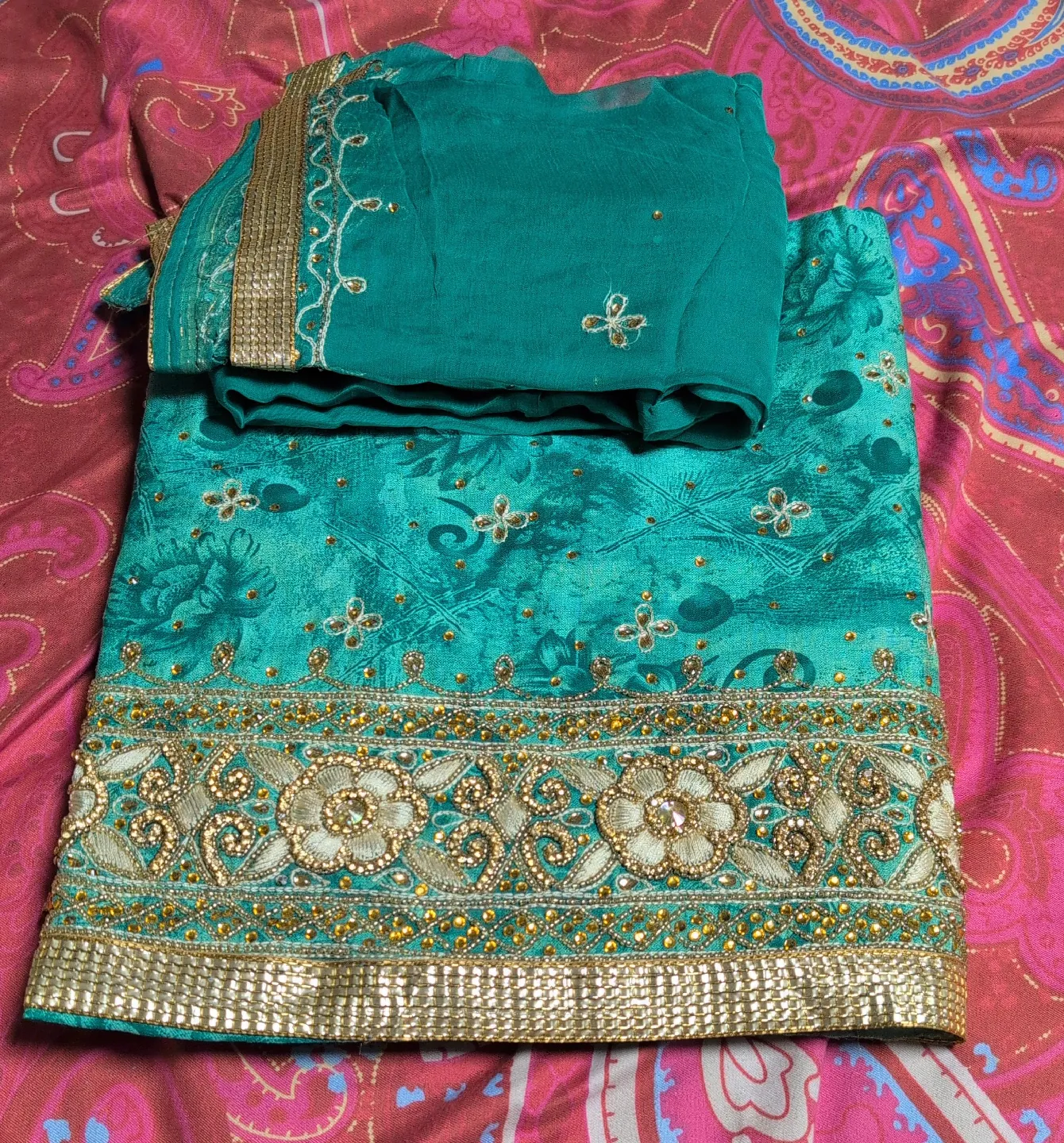 Beautiful teal salwar kameez set. Features intricate gold and white embroidery with sequin and bead detailing. Made from a lightweight fabric, it's perfect for special occasions. Offers a stunning look for festive events!