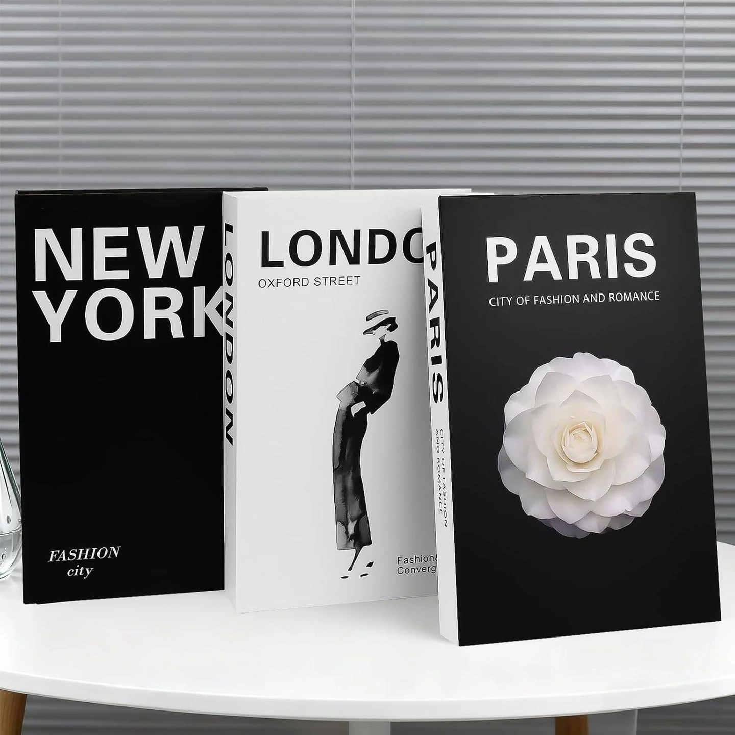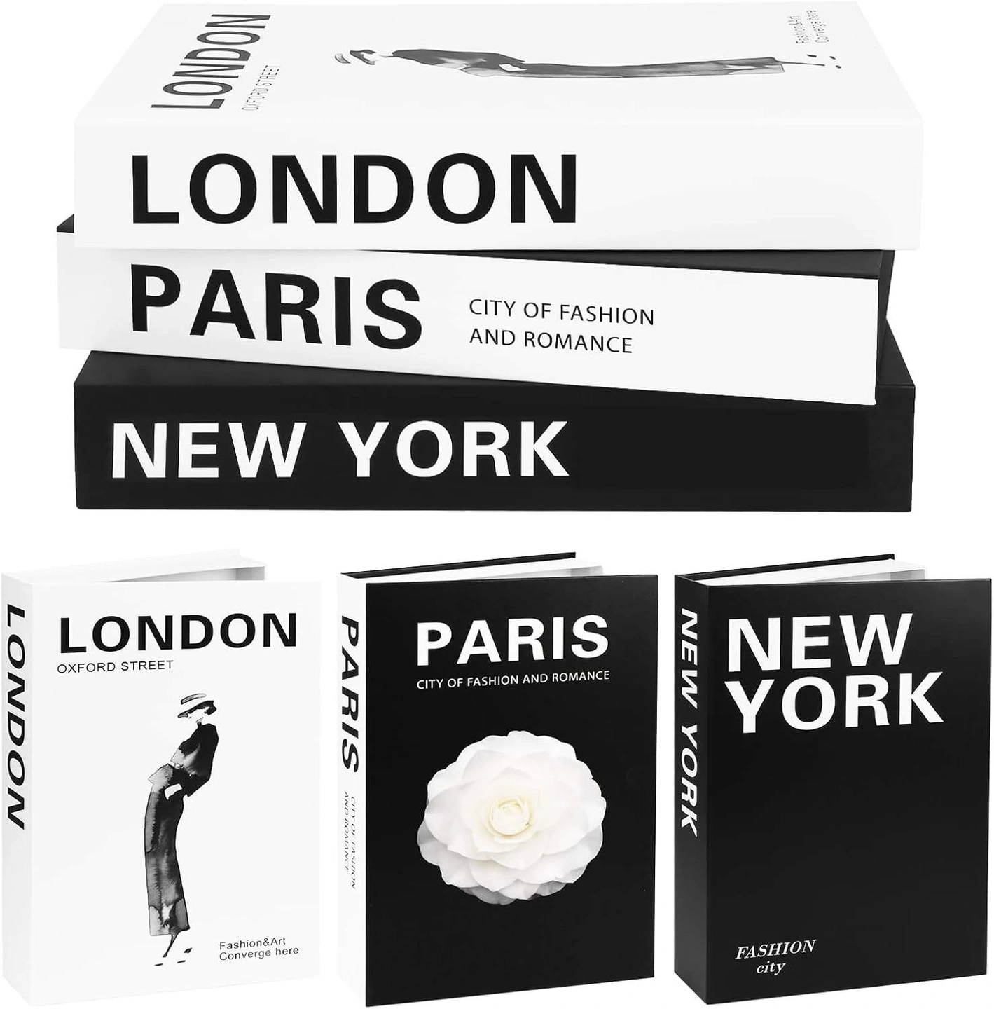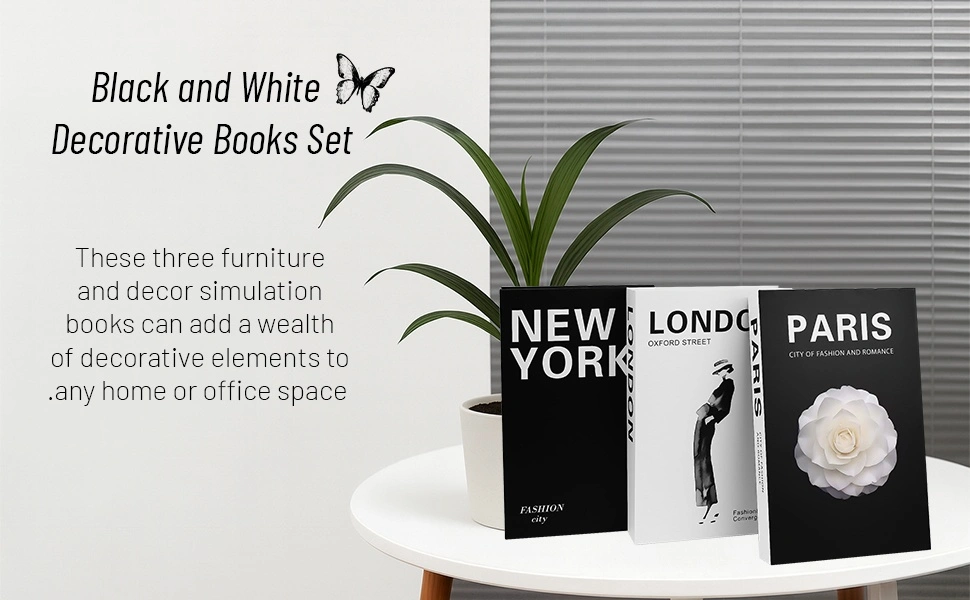 Add a touch of elegance to your home or office with this set of decorative books! The set includes three books with "Paris, London, New York" printed on the spines, perfect for adding a stylish touch to any coffee table, shelf, or desk. They can also be used as a storage box!