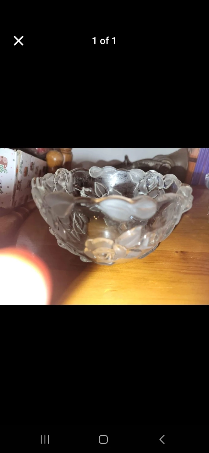 This clear glass bowl features delicate rose embossing around the exterior. It's perfect for serving snacks or as a decorative piece. A lovely addition to any kitchen or dining table!