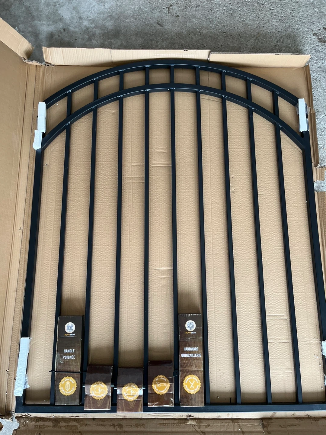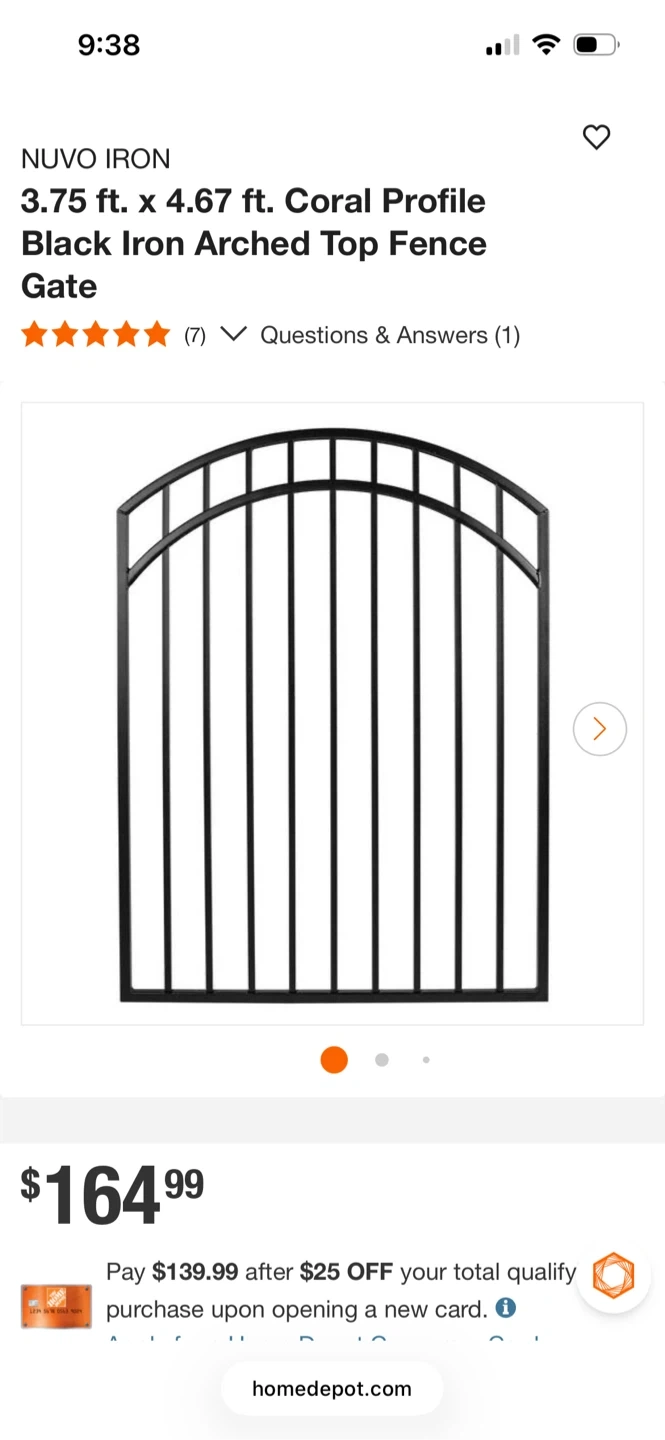 This Nuvo Iron Coral Profile fence gate is made of black iron with an arched top. It's designed for openings 46" wide and includes hardware for installation. Galvanized steel construction. Brand new in box. Must pick up. You’ll need a SUV or bigger.