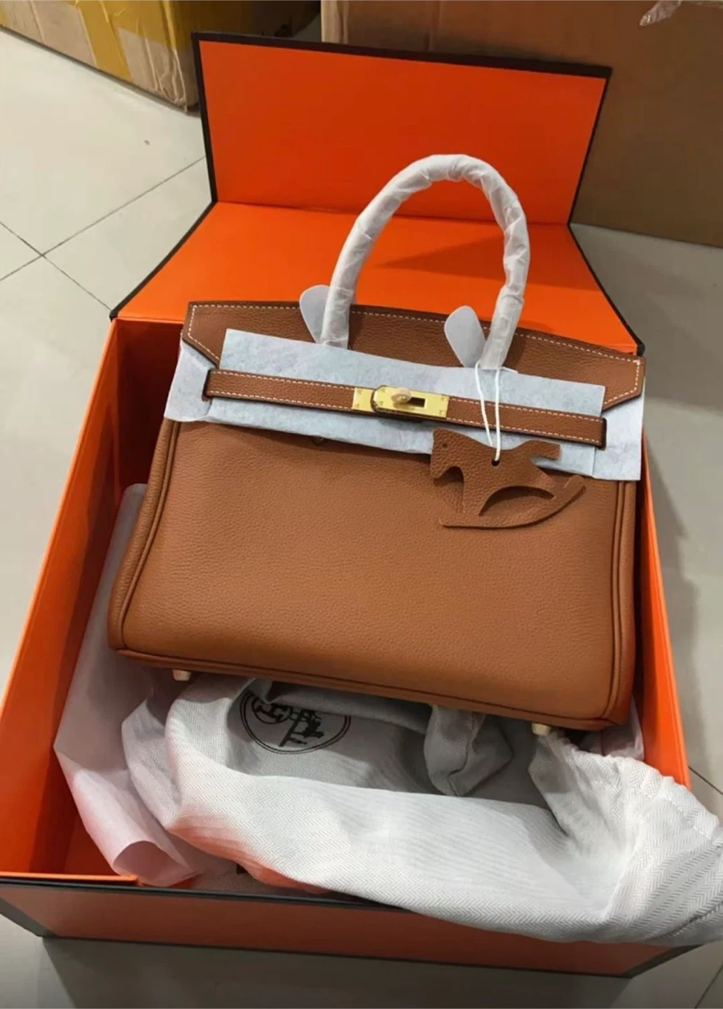 This is a classic tan leather handbag with gold-tone hardware. It comes in its original box with a dust bag and a horse charm. The pebbled leather and structured design make it a stylish accessory. This bag is perfect for a night out or for everyday use.