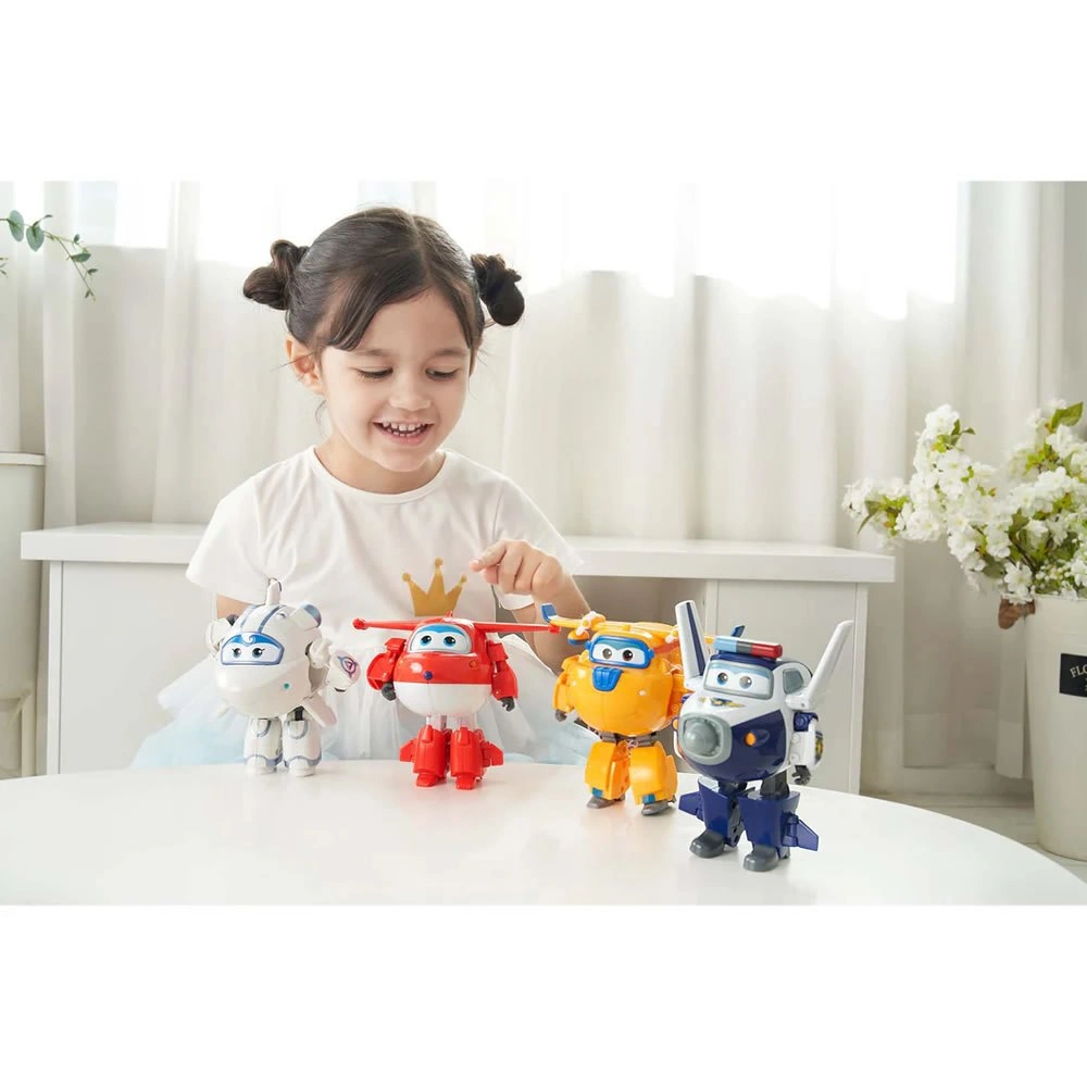 The popular characters are perfectly matched together. The toy set features 4 fan-favorite characters in transform-a-bot: Jett, Paul, Astra and Donnie. The Super Wings team is always ready to transform and use teamwork on any mission to rescue, help and teach kids about the languages and cultures of the world. This toy is ideal for birthdays, parties, Children's Day, Christmas, Halloween, Thanksgiving and New Year's. This is a simple educational toy that allows children to operate independently and enjoy themselves with their parents and friends. Perfect gift for kids ages 3 years and up.