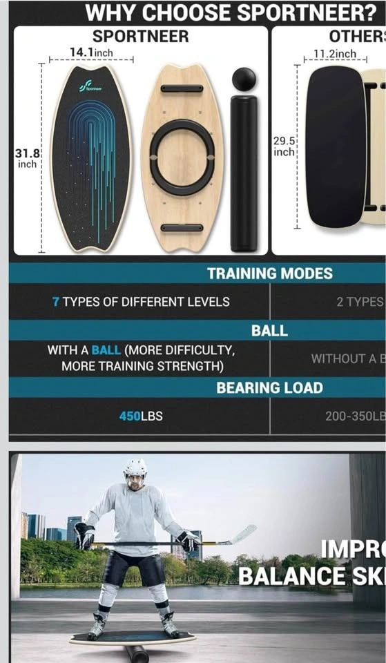 Brand new Sportneer balance board with 7 modes, adjustable stoppers, roller, and balance ball. Great for core training, stability workouts, physical therapy, and balance improvement. Non-slip surface.
