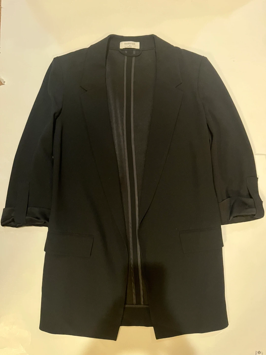 This is a black Babaton blazer. It features a collarless design and cuffed sleeves. Made for a stylish layering piece.