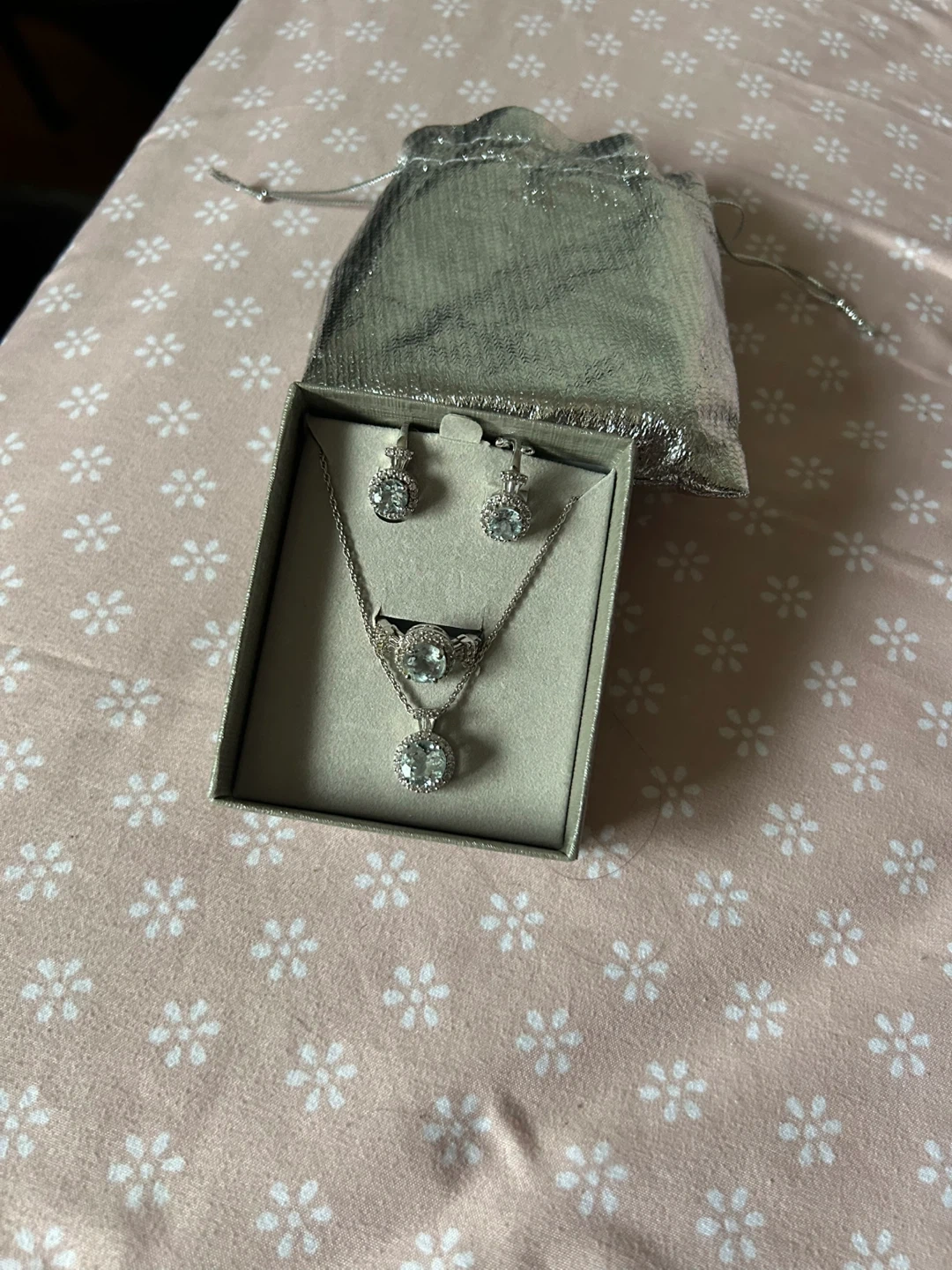 This is a three-piece jewellery set from Peoples Jewellers. It includes a necklace, a pair of earrings, and a ring. The set comes in its original box with a soft pouch. Would make a great gift. Purchased for around $150 from Peoples.