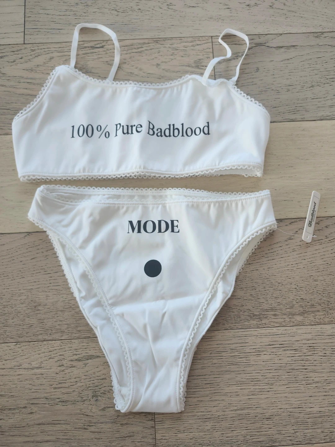 White lingerie set featuring a crop top with "100% Pure Badblood" text and matching high-waisted panties with "MODE" and a black dot design. Lace trim on both pieces. Made with a soft, likely synthetic material.