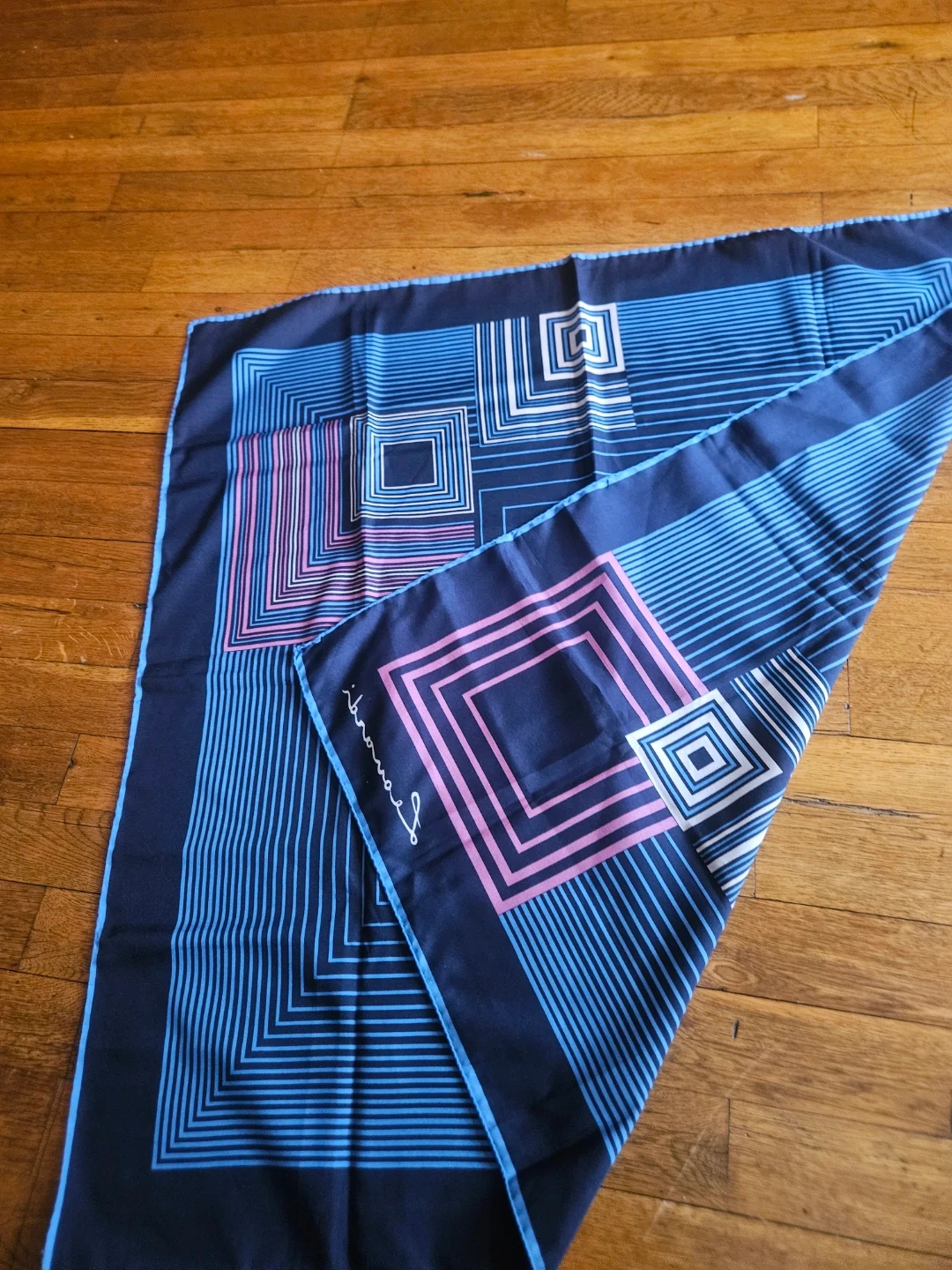 This is a Leonard Paris scarf featuring a geometric pattern. It's a stylish accessory with blue, pink, and white colors. The scarf's material appears to be silk.hand stitches.
