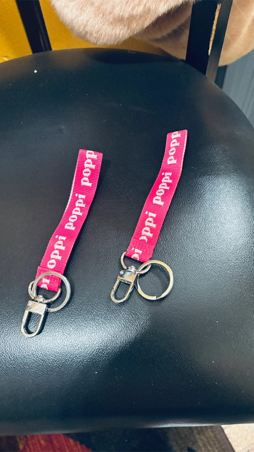 Set of two pink fabric keychain lanyards. Each features the repeating 'poppi poppi' text and includes a metal clasp and keyring. Great for keys or small accessories!