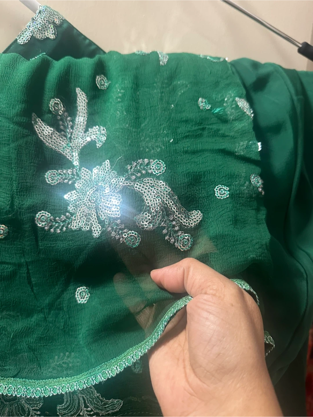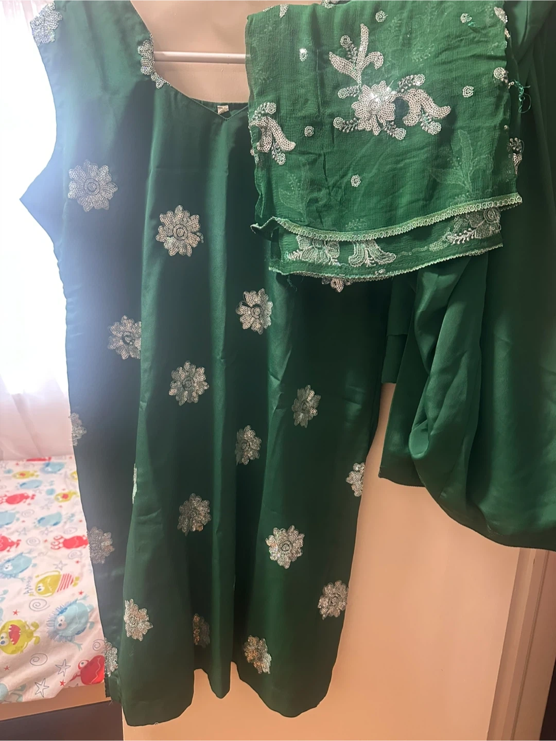 Selling a beautiful green salwar kameez suit. It features lovely embroidery and is perfect for special occasions or everyday wear. The fabric feels nice and comfortable. Comes with the top, bottom, and matching dupatta! New, never wear. Size 48. But can be make any size.