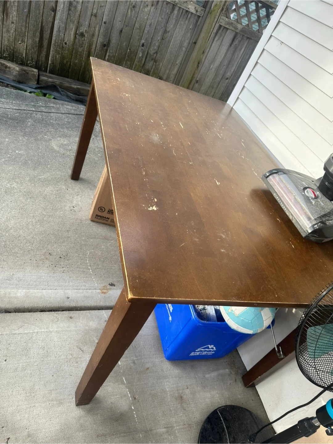 Selling a wooden dining table. It's sturdy and ready for a new home. Perfect for family dinners or game nights!