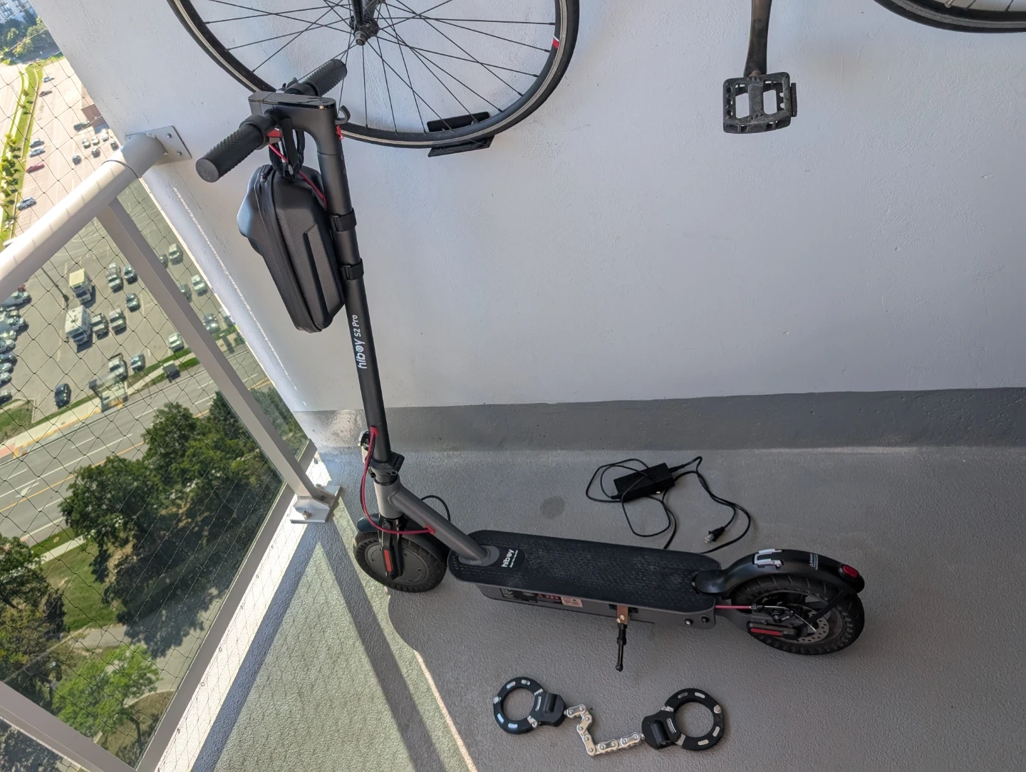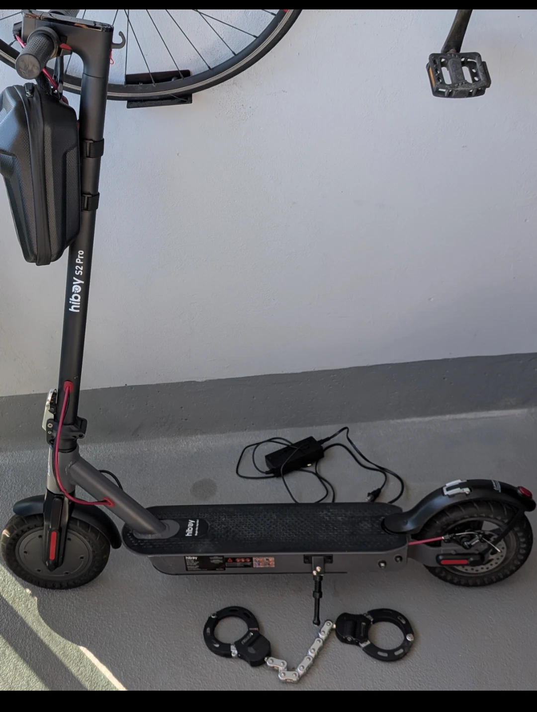 Hiboy S2 Pro electric scooter. Comes with charger and a handlebar storage bag. It's grey with red accents. Great for getting around town!