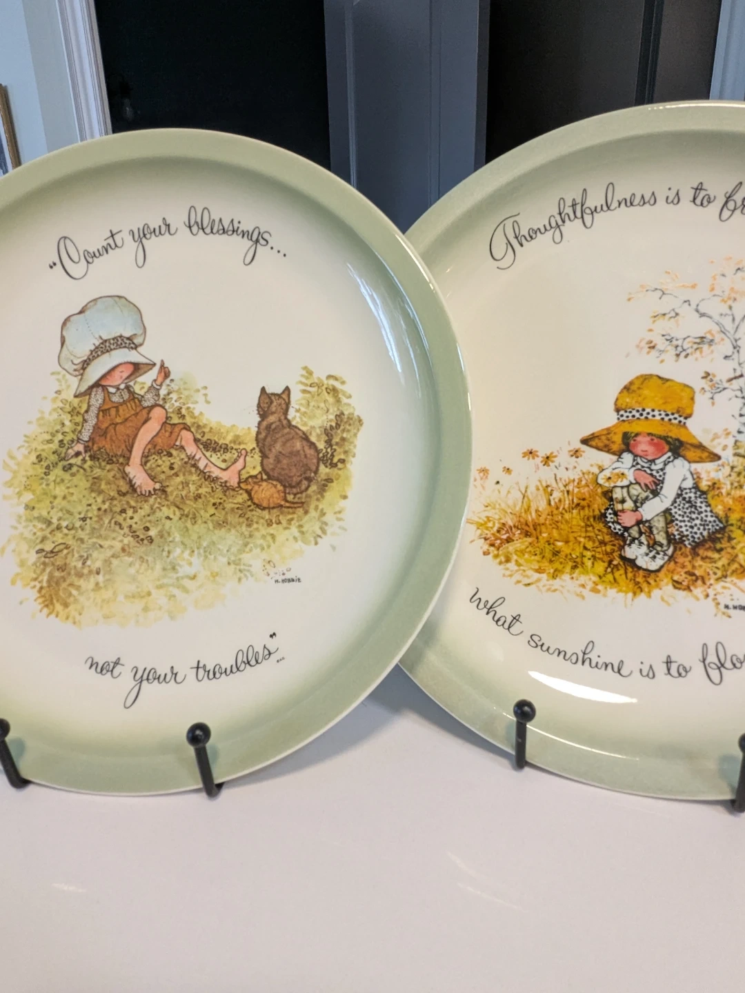 This set includes two decorative plates featuring H. Hobbie artwork. One plate shows a girl with a cat, and the other depicts a girl under a tree. Both have uplifting quotes. They're lovely pieces for display!