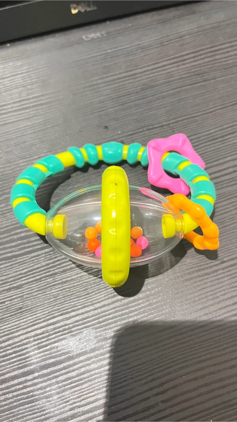 This colourful rattle and teether toy is designed for little hands. It features a clear middle section with beads that make a gentle sound when shaken. The bright plastic pieces are perfect for grasping and chewing. A fun sensory toy for babies!