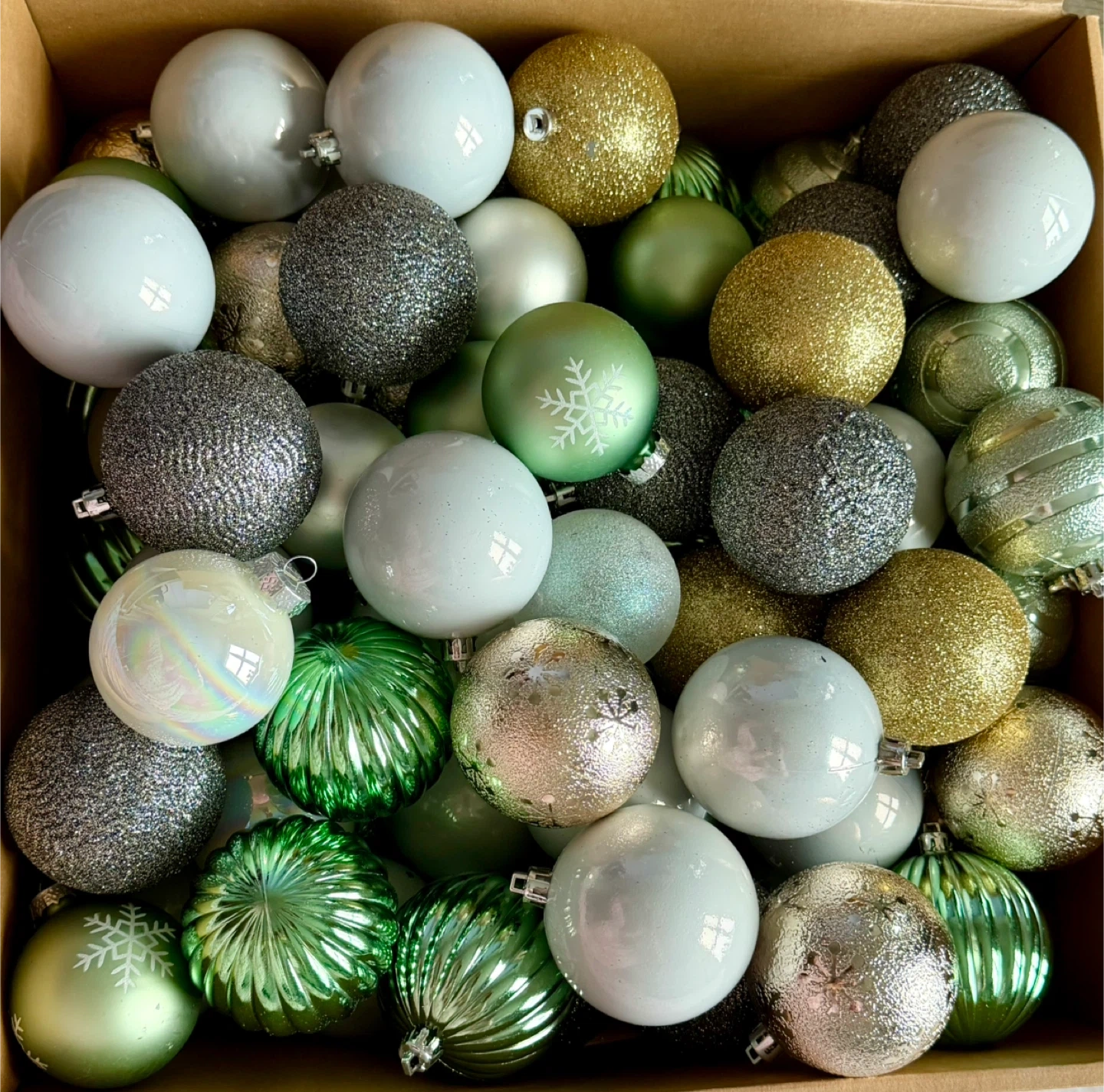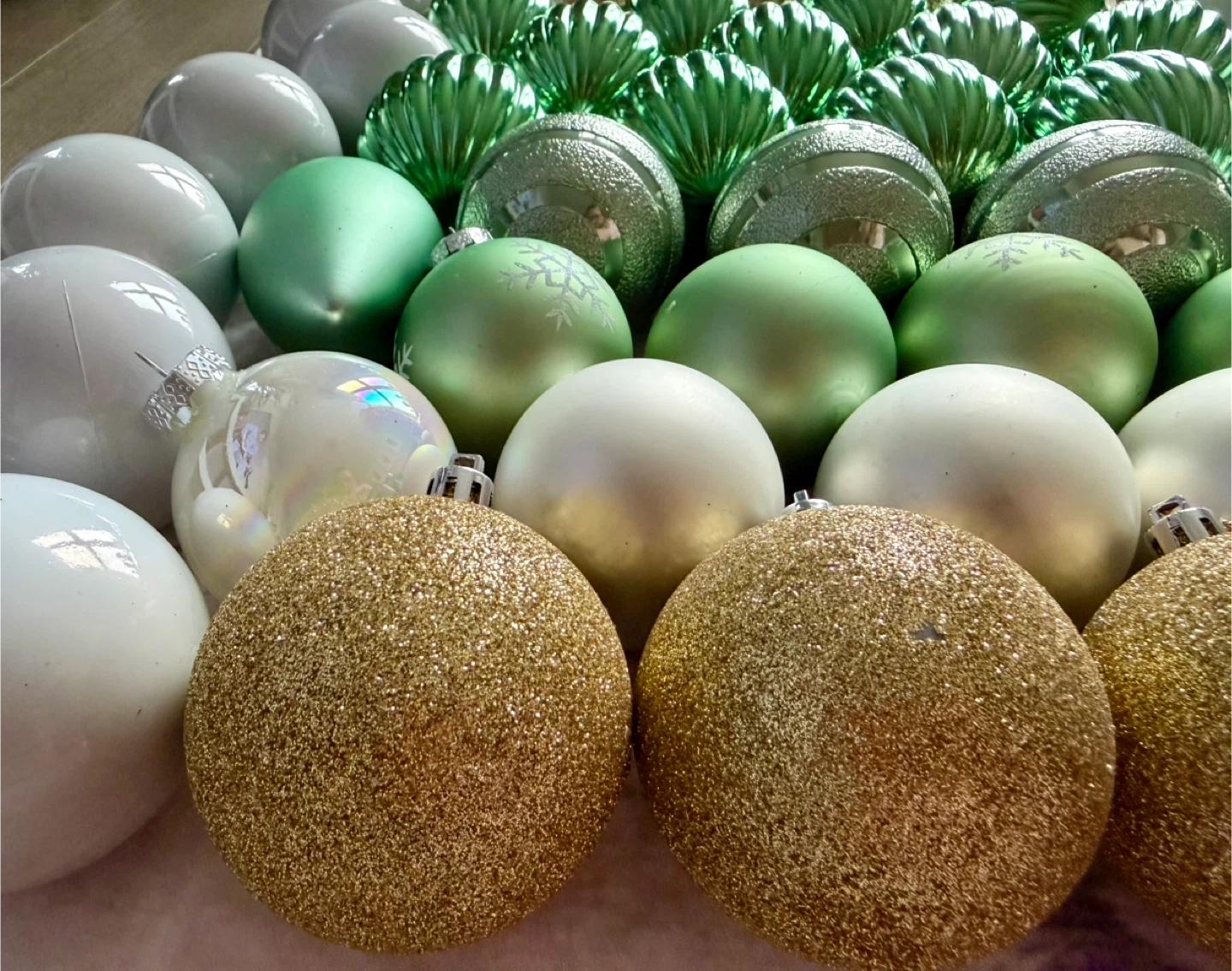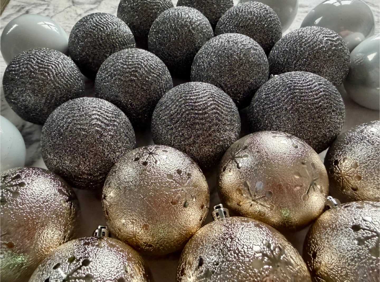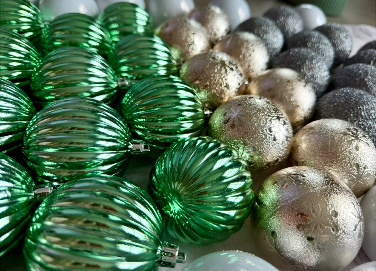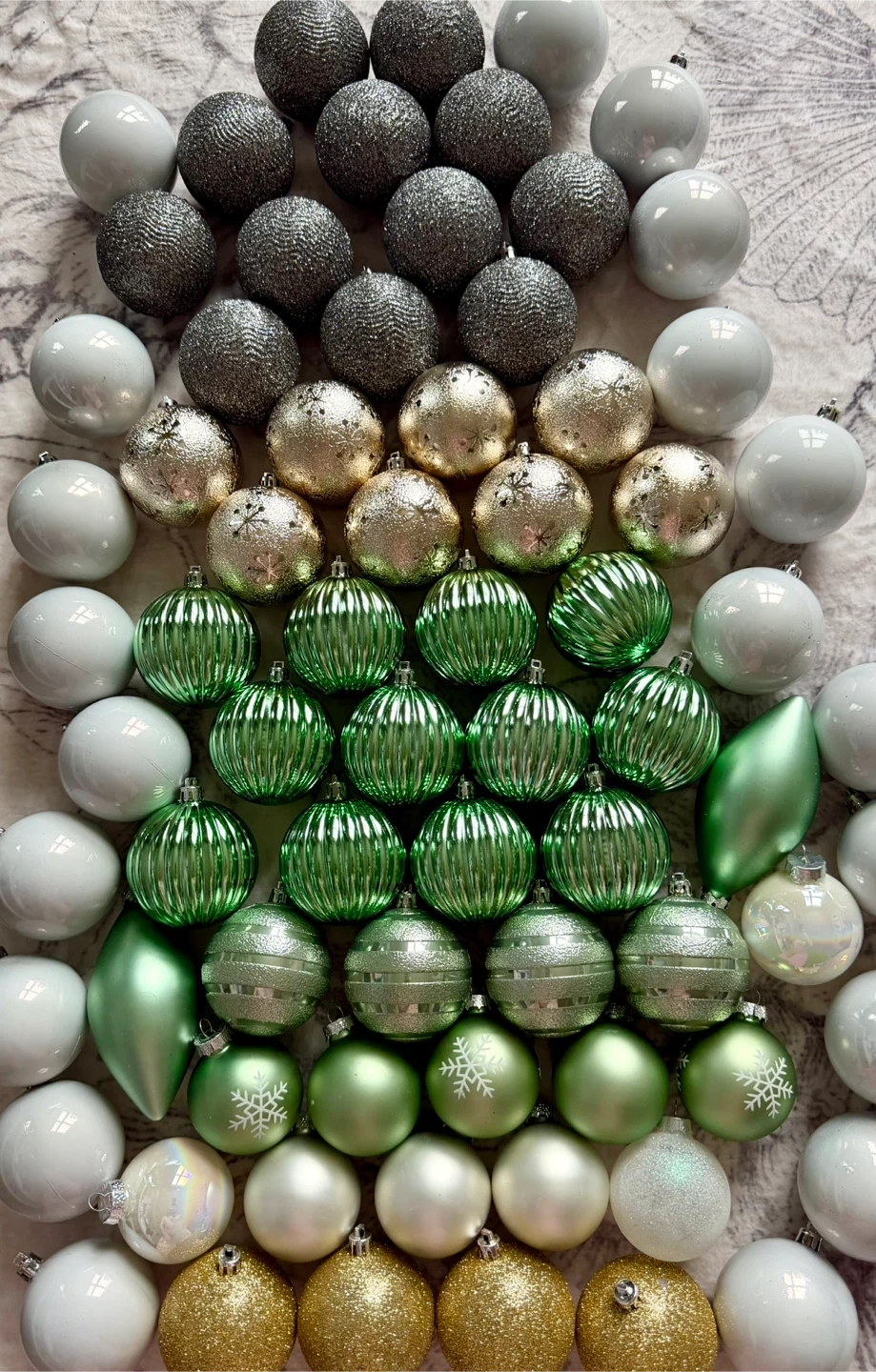 It’s Bella Lux complete set of 73 high-quality Christmas baubles. They are shatterproof, so they look like high-end glass but are much more durable and safe for kids or pets.