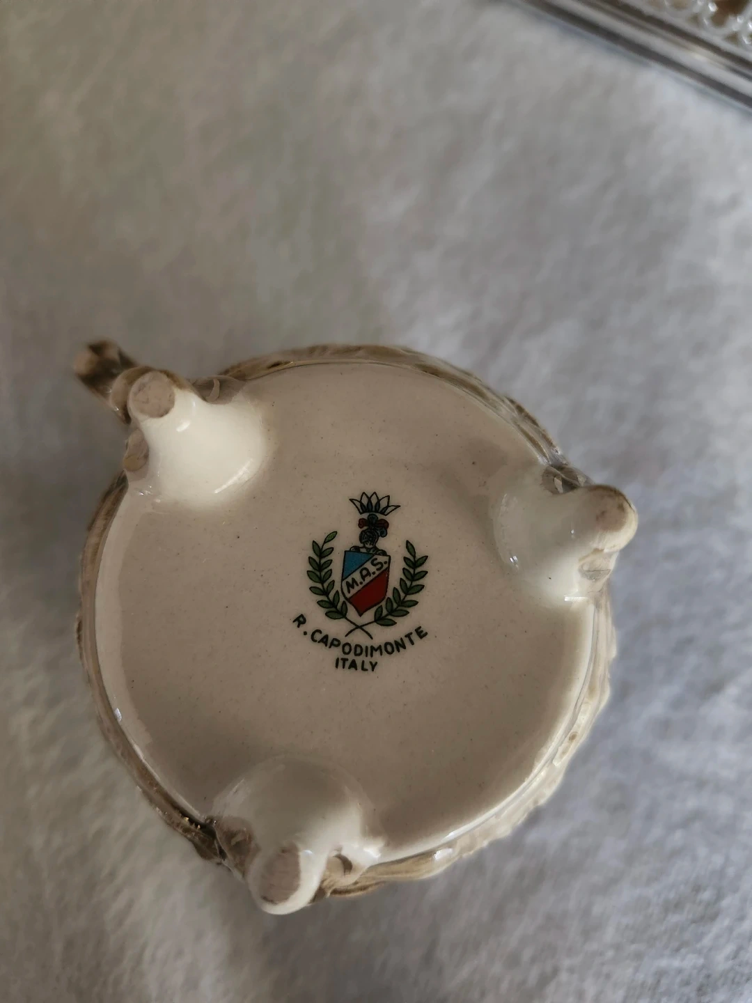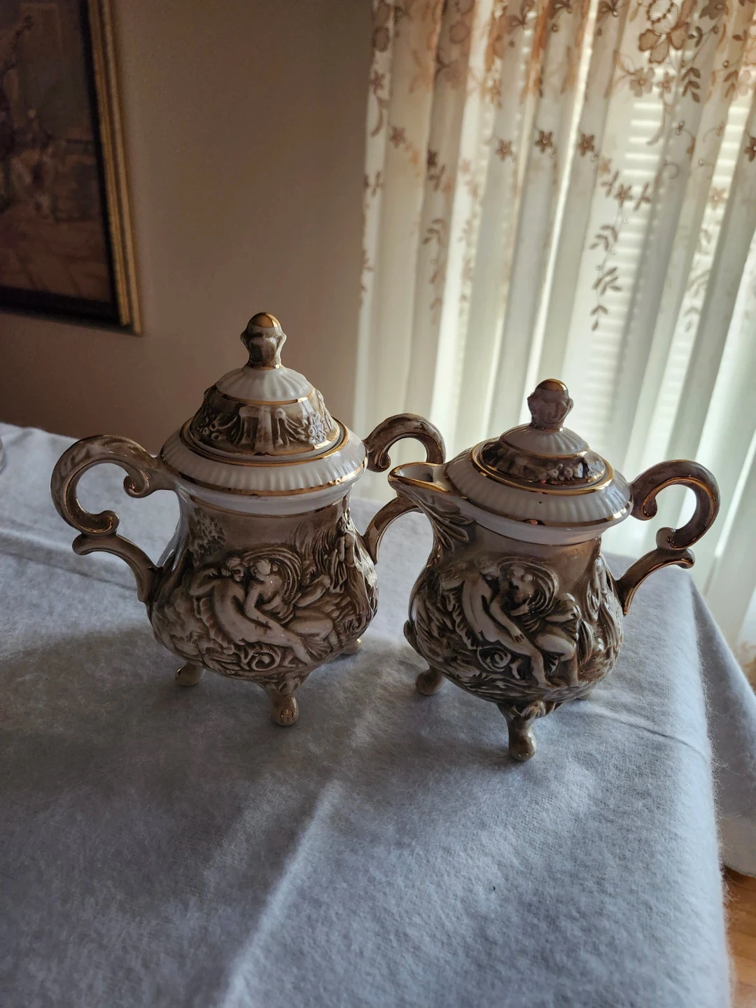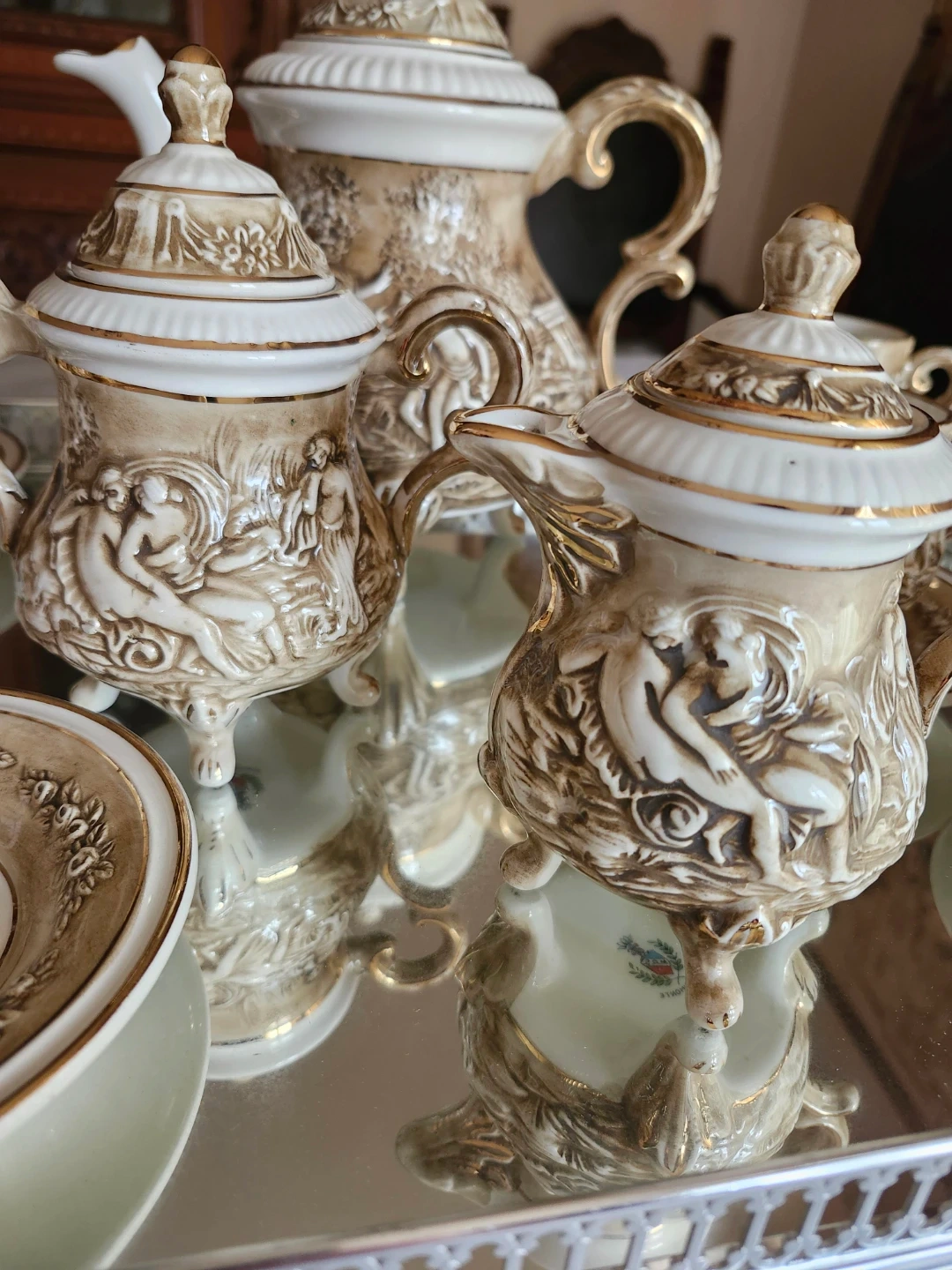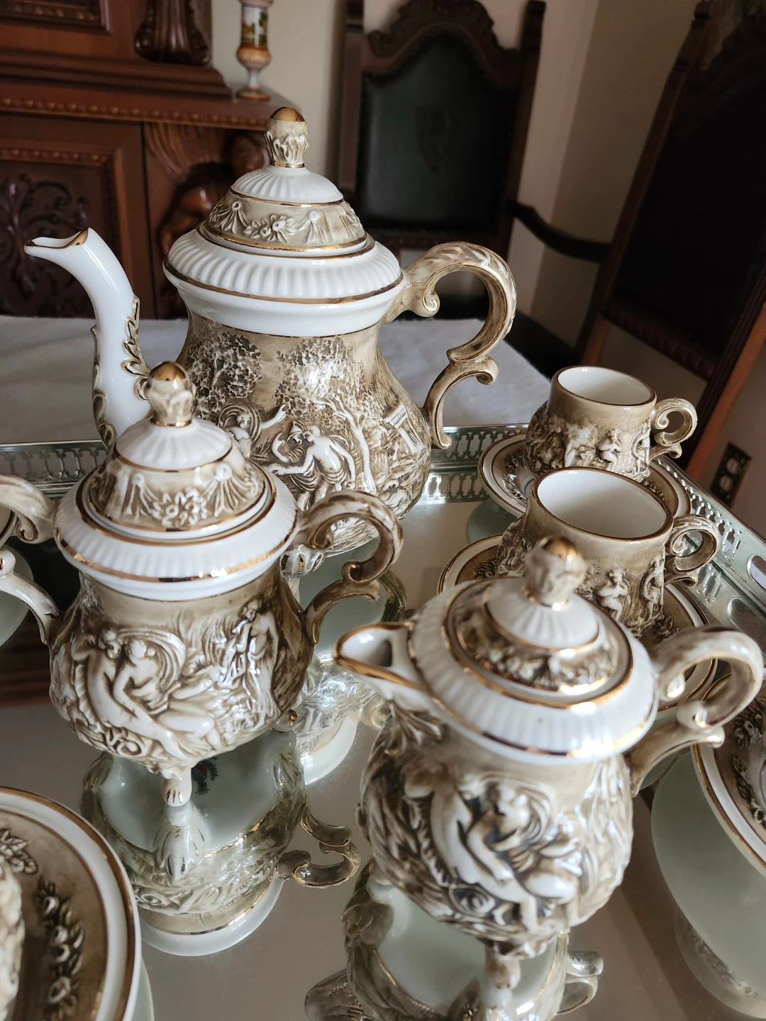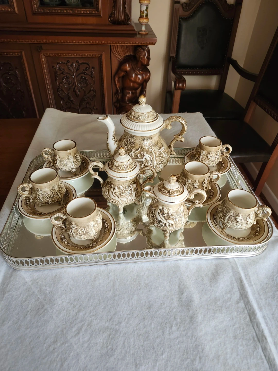 This 19 piece set has been in our family for 45+ years and has never been used. It's been displayed in our dining room cabinet. Set includes 6 coffee cups, 6 saucers, cream and sugar set with lids, coffee pot with lid, and mirrored tray. Cherub design in neutral colors. Prestine condition, no chips, like new. Smoke free, pet free home.
