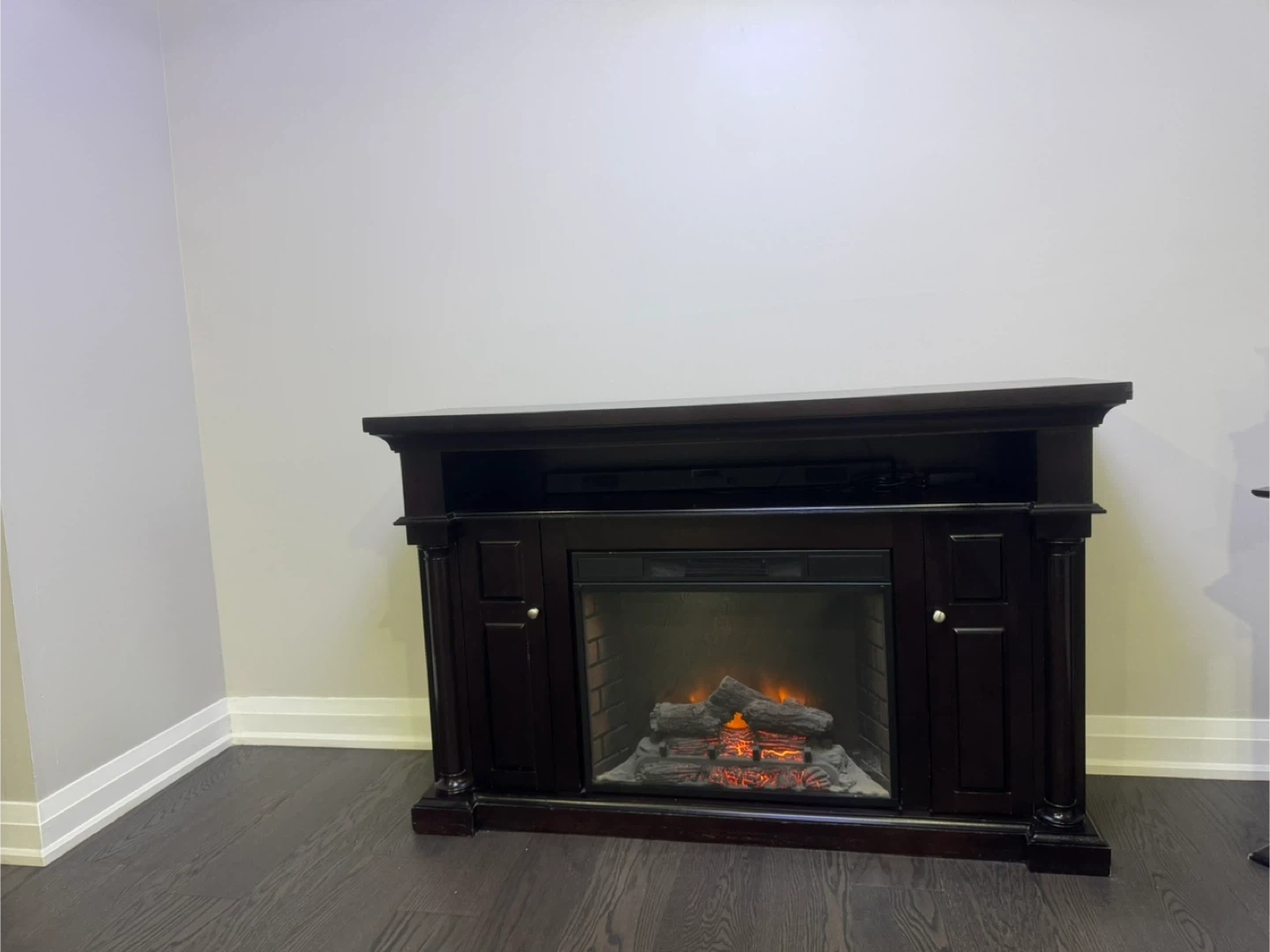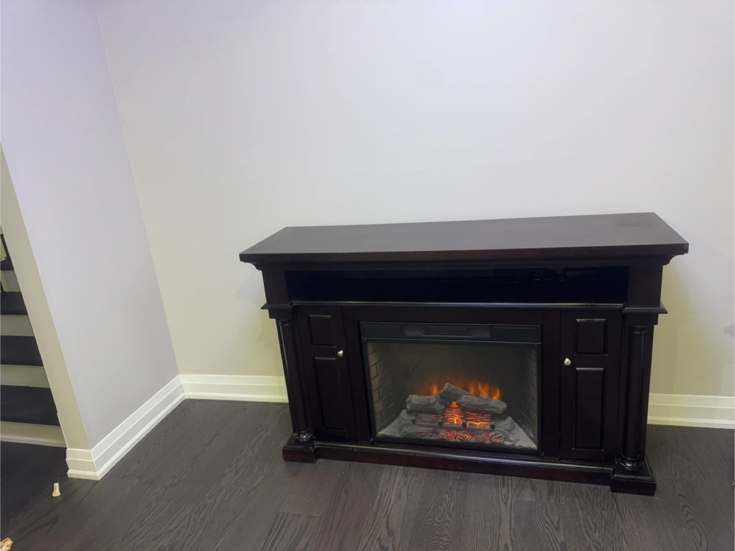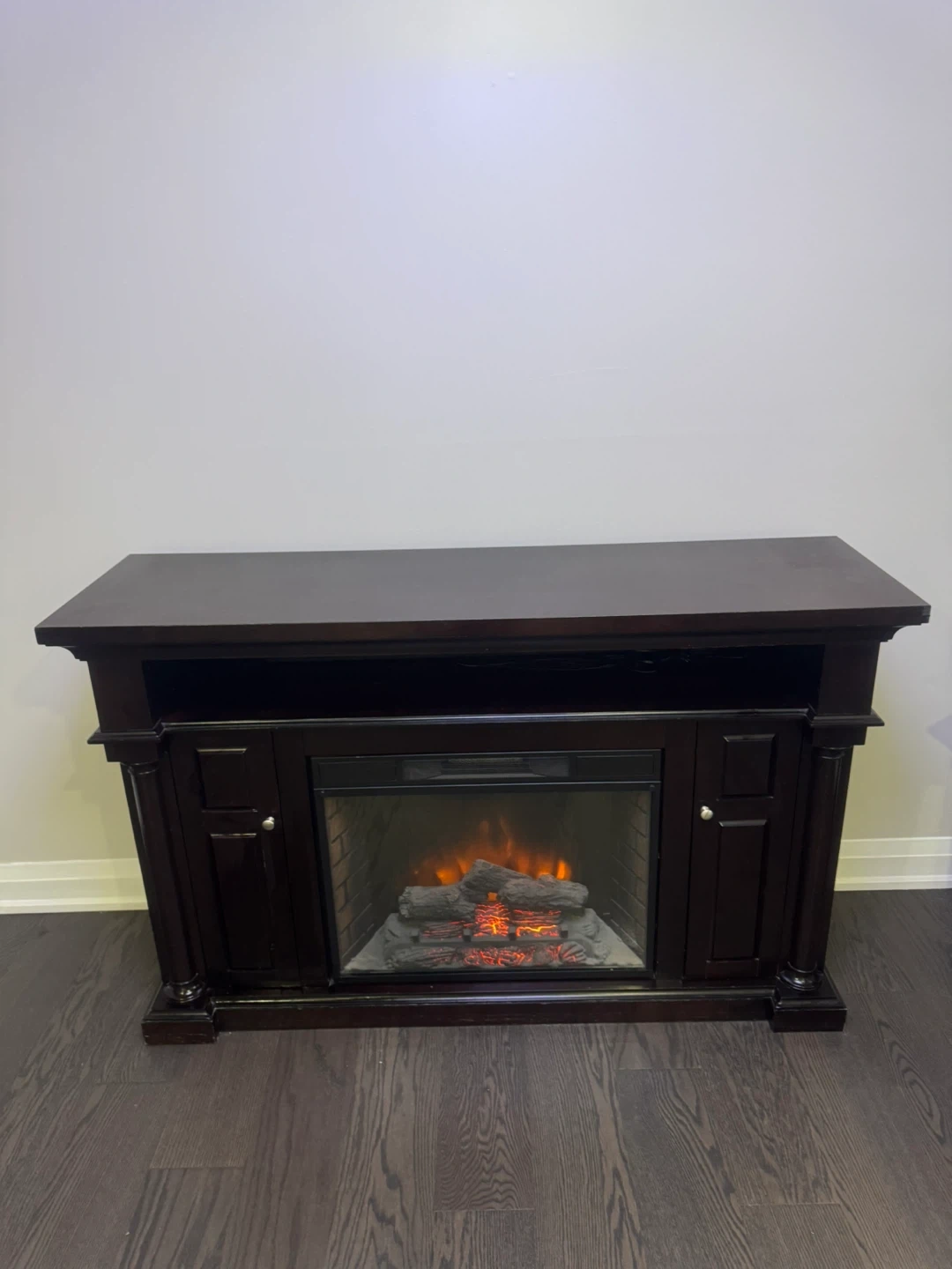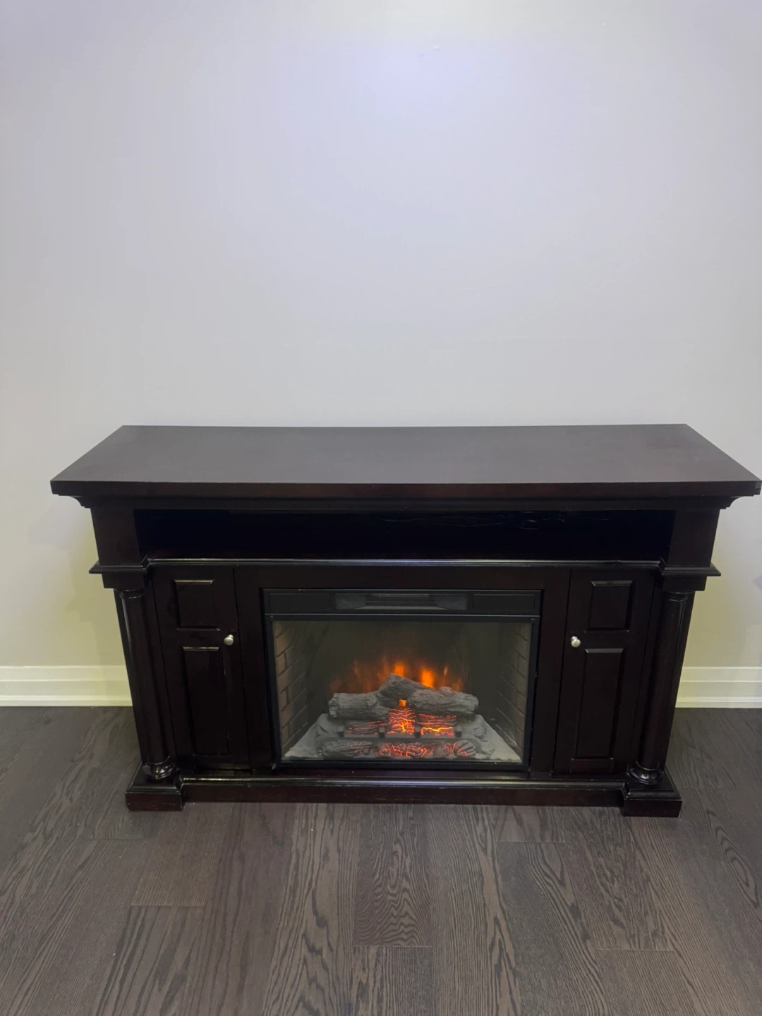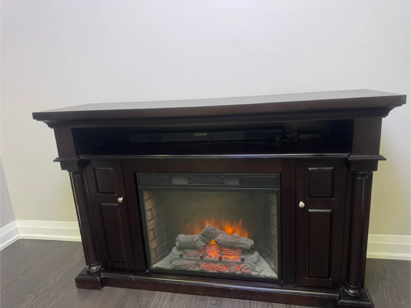 Selling a dark brown electric fireplace TV stand. It's in good condition and adds a cozy touch to any room! The fireplace feature works great and provides extra warmth during the colder months. It's perfect for holding your TV and media consoles