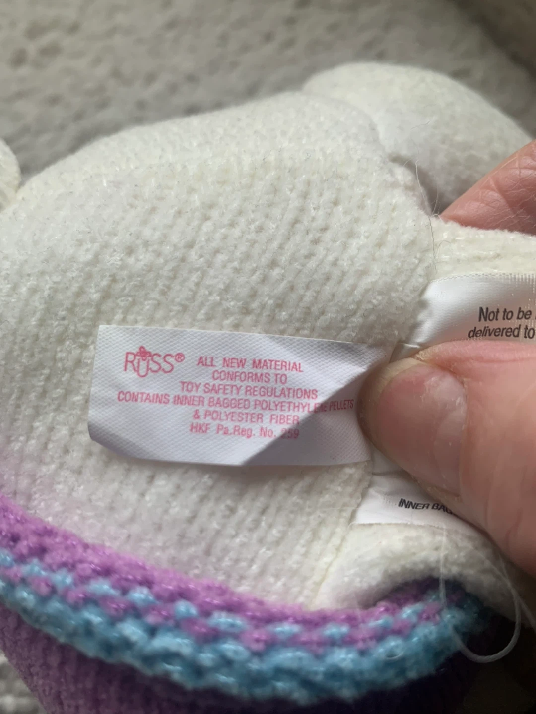 Adorably sweet Boodles stuffed bunny toy wearing a pink hat and purple sweater. It's made of polyester fibers. Surface washable for easy care.