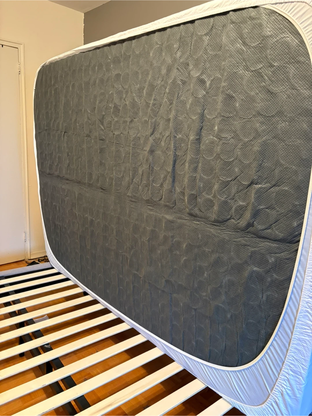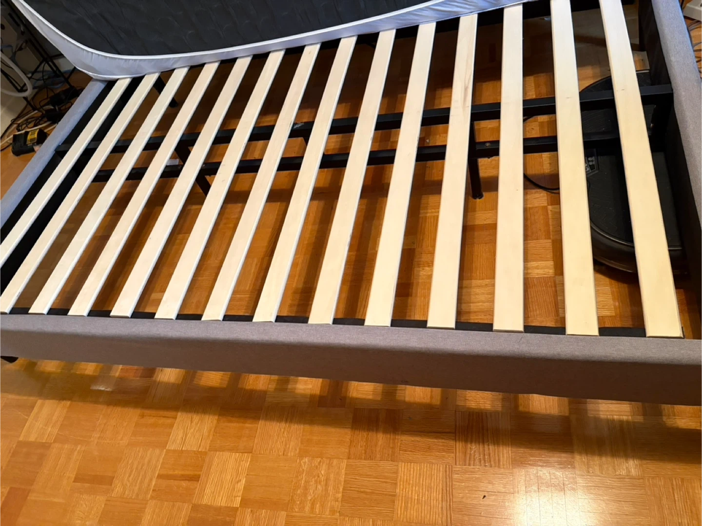 This is a grey upholstered bed frame with wooden slats. It's designed for durability and support. The frame measures full size.