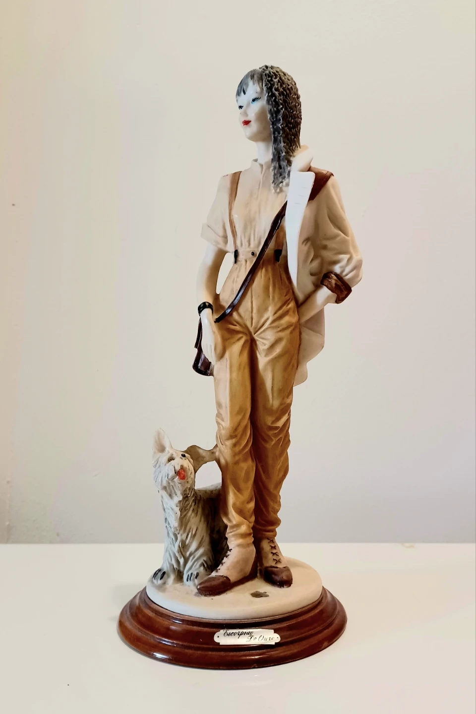 Vintage, Collectible Escorpiao De Ouro Figurine of a woman with a dog, in good condition. It makes a great curio!