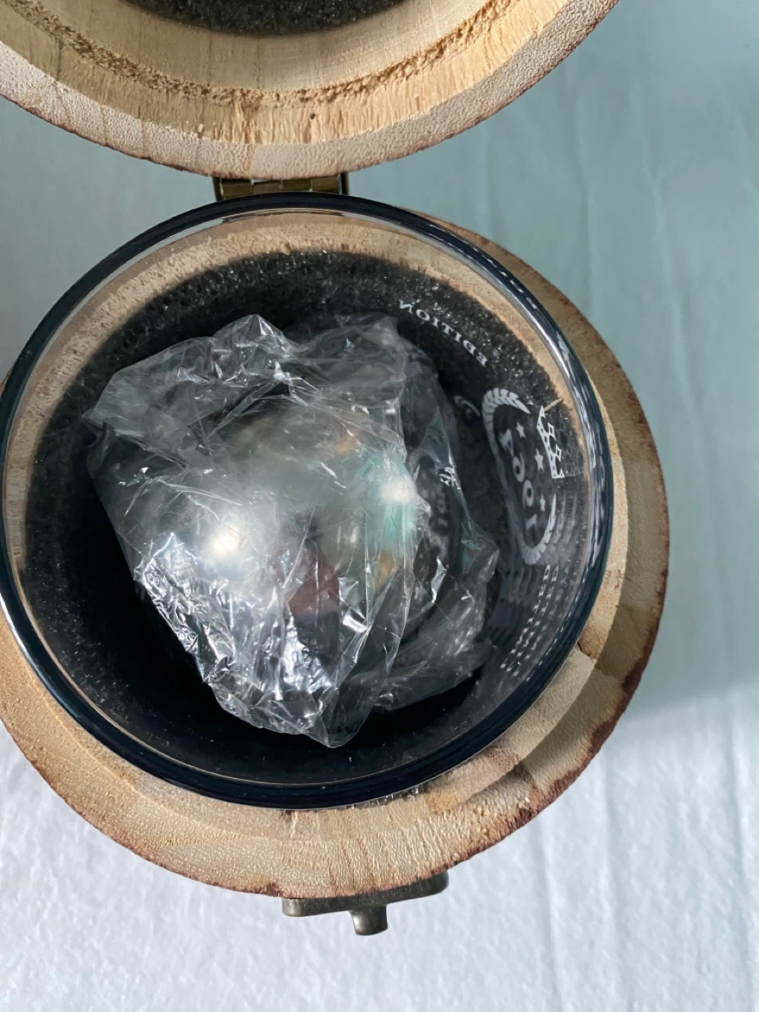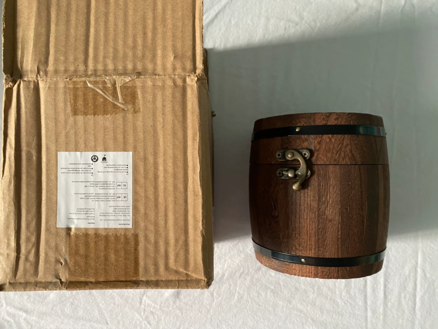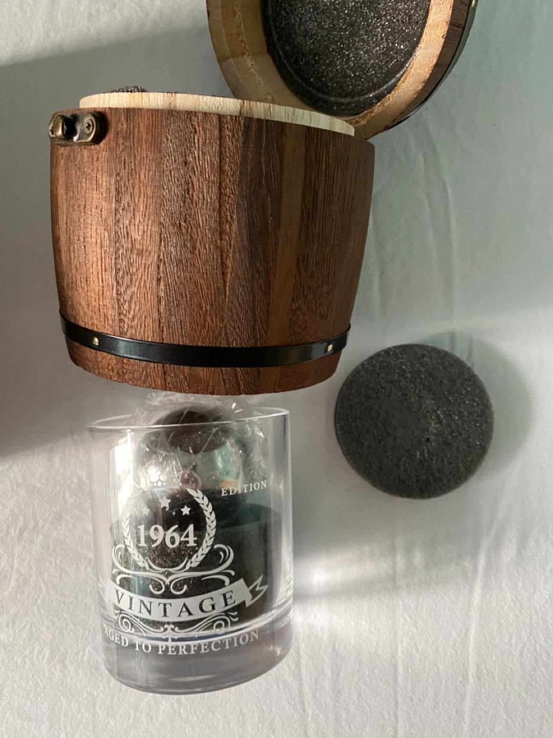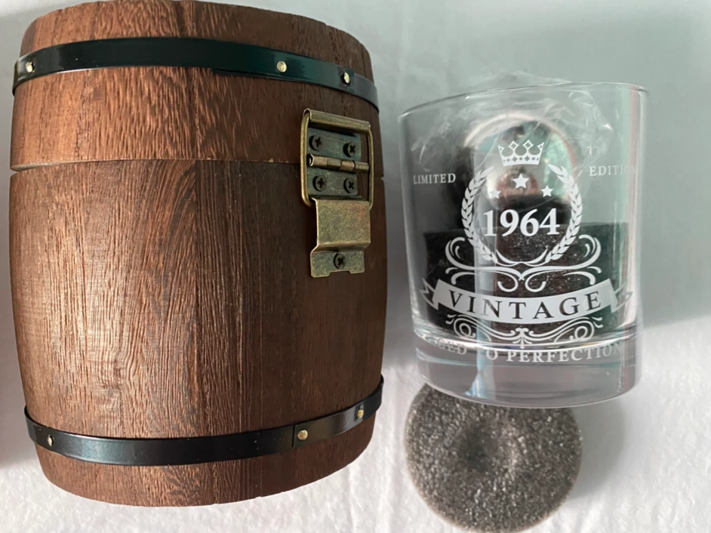 This is a unique glassware set featuring a glass with "1964 Vintage Limited Edition" printed on it. It comes presented in a decorative wooden barrel-shaped display box with metal accents and a clasp closure. The glass is protected inside the foam-lined barrel.