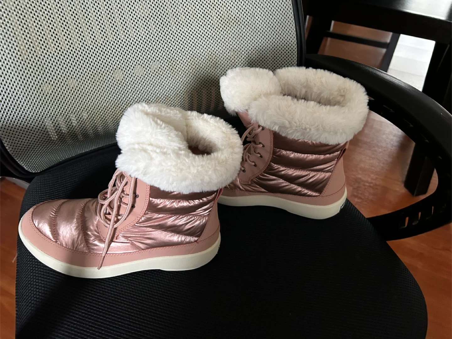 These Sperry winter boots are a lovely rose gold color and feature a cozy faux fur lining. They have a lace-up closure for a secure fit and a durable sole. Perfect for keeping your feet warm and dry during cold weather!