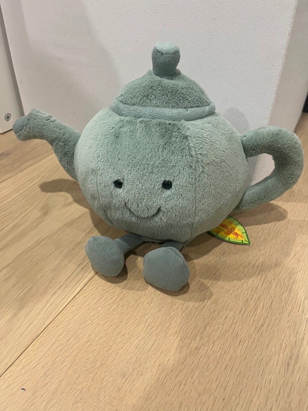 retired jellycat. Super cute sage green teapot plush. Small size, perfect for cuddling. Soft and cuddly material. Great gift for tea lovers.