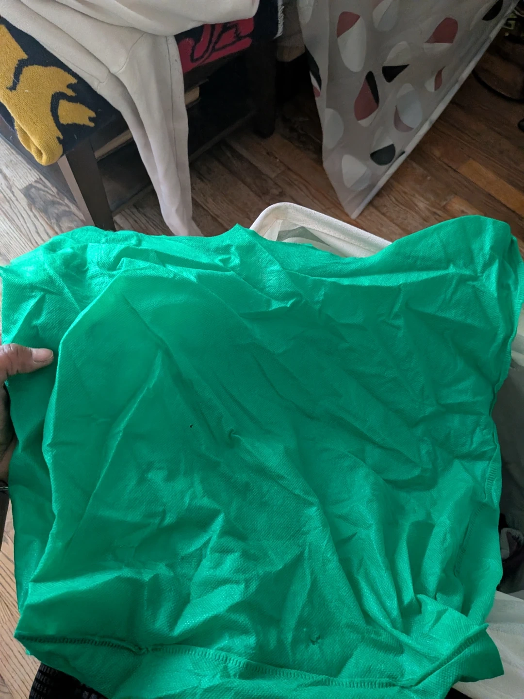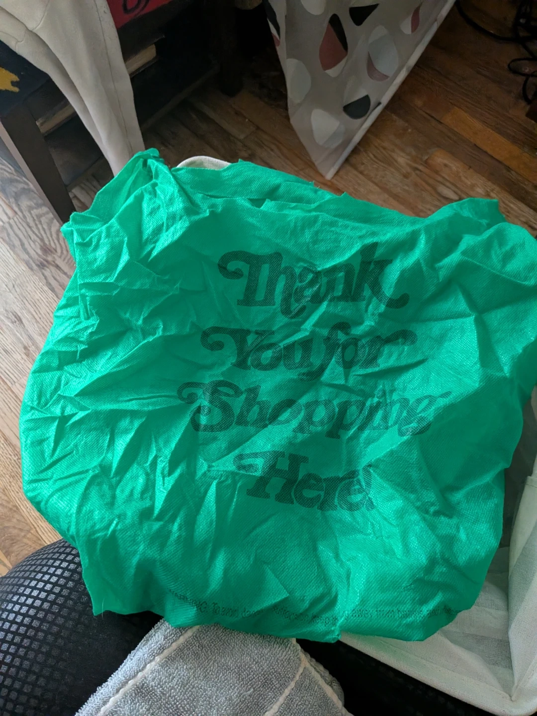 Bright green reusable shopping bag. It reads "Thank You for Shopping Here" in black text. Material is a durable, woven fabric. It's large enough for groceries or everyday items!
