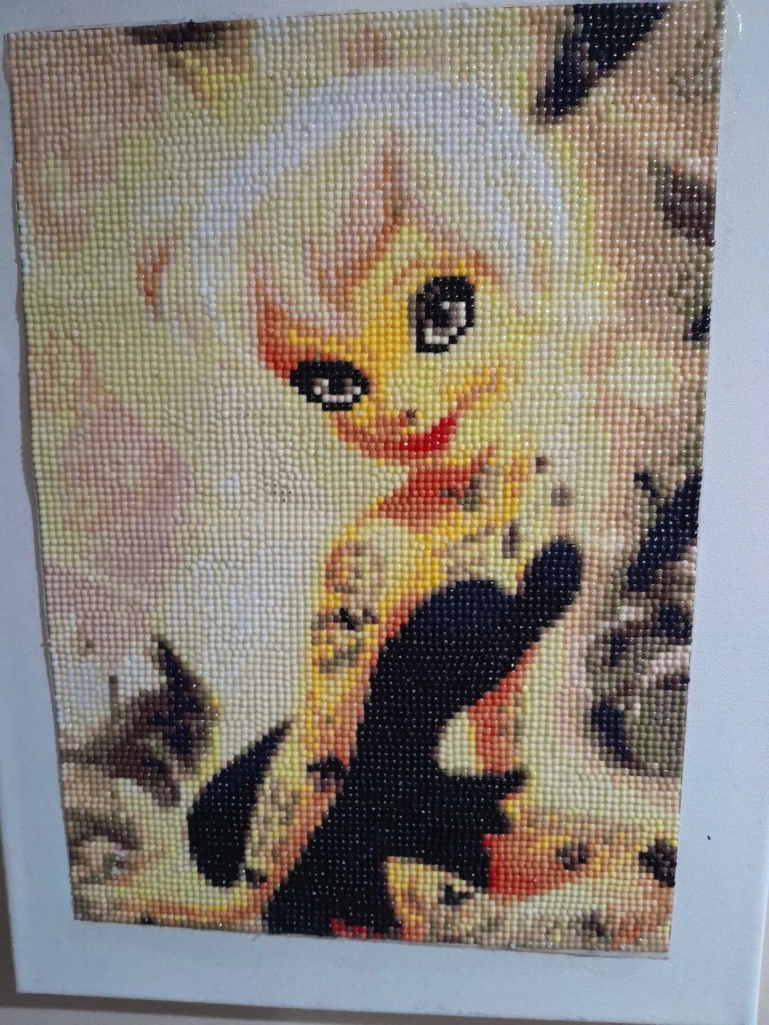 This is a finished diamond painting featuring a "bad" Tinkerbell in black. The art uses a variety of colourful beads to create a vibrant image. It's a unique piece that would add a touch of whimsy to any room!