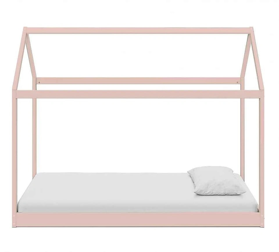Low profile Twin size bedframe in a cute house shape, light pink color.