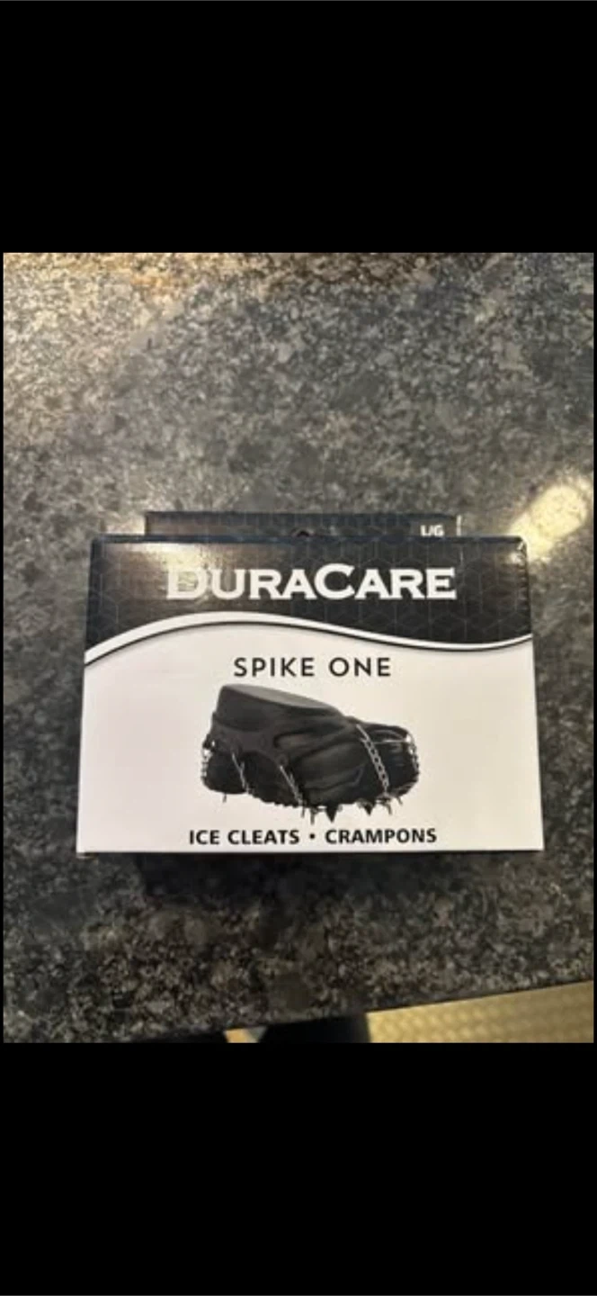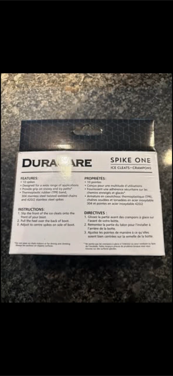 DURACARE Spike One ice cleats with 10 spikes. Made with a flexible TPR rubber base and stainless steel spikes. These cleats offer a secure grip for walking on icy surfaces. Useful for winter outdoor activities.