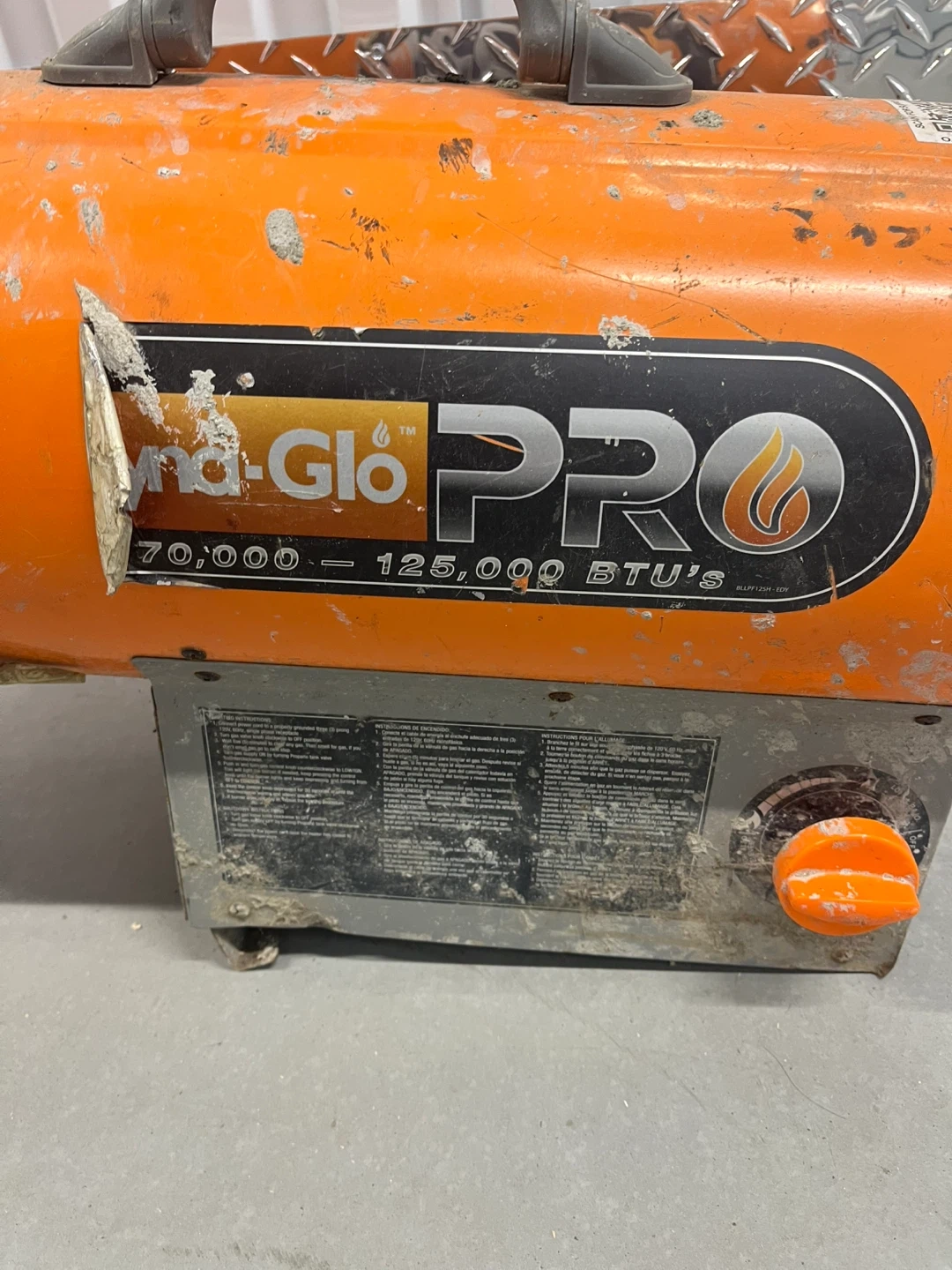 This Dyna-Glo Pro heater offers adjustable heat output from 70,000 to 125,000 BTUs. It's a portable unit designed for various heating needs. It includes a carrying handle for easier transport.