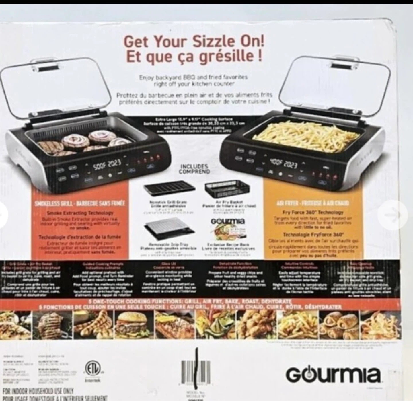 This Gourmia FoodStation grills, air fries, roasts, bakes, and dehydrates with smoke extracting technology for virtually no smoke. It features a bottom-heated grill grate up to 510°F and a 4.9 L air fry basket. Includes removable grill grate, air fry basket, and drip tray. Please contact if the price and pick up location works for you. Pick up is closer to mayfield and Kennedy - border of Brampton and Caledon