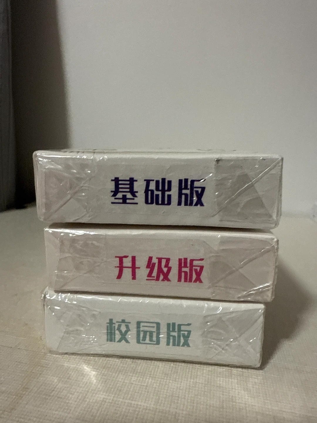 This listing is for a stack of three sealed card game boxes. The boxes include 'Basic Edition', 'Upgraded Edition', and 'Campus Edition'. They're suitable for ages 5 and up. Made in China.