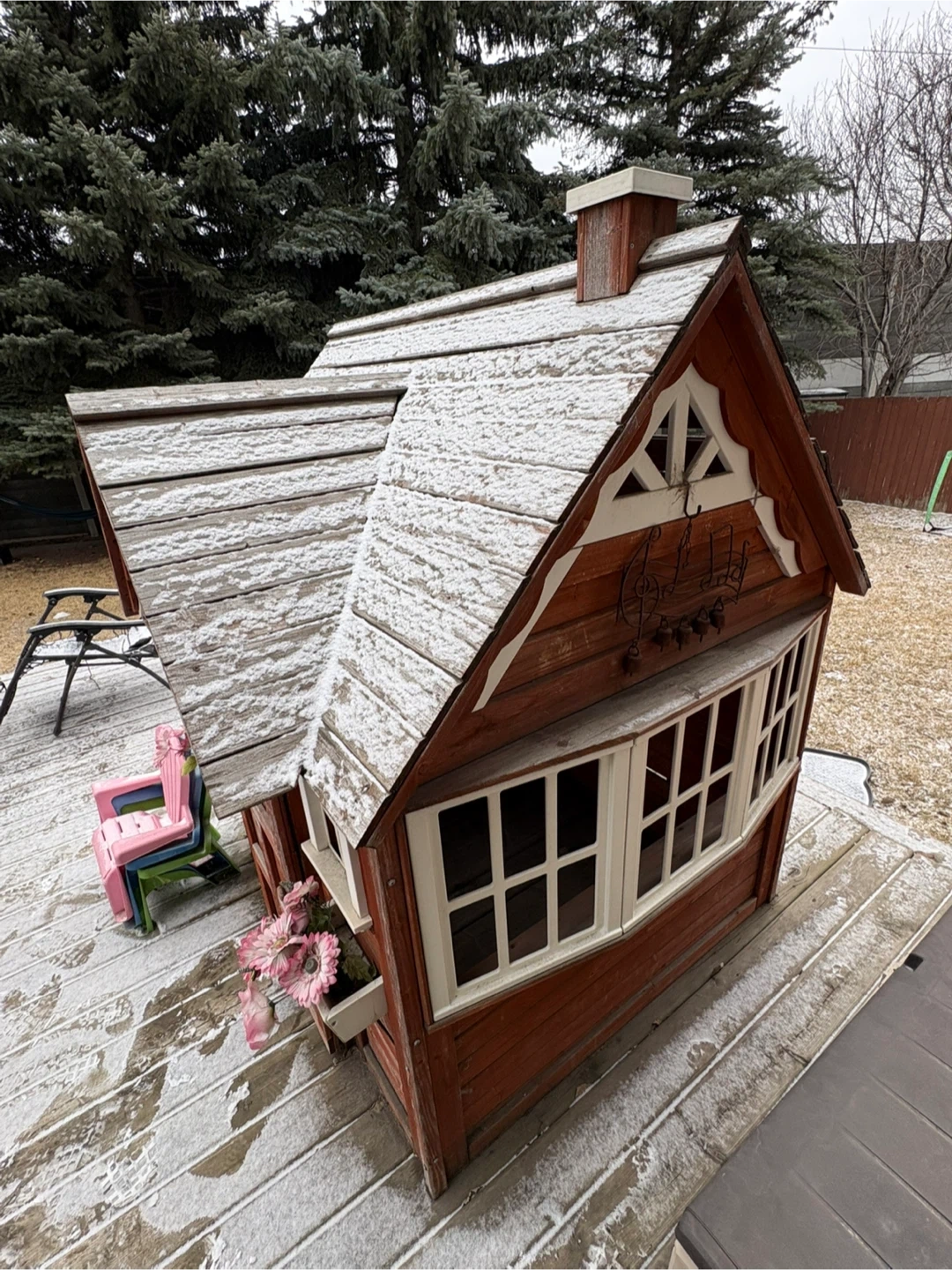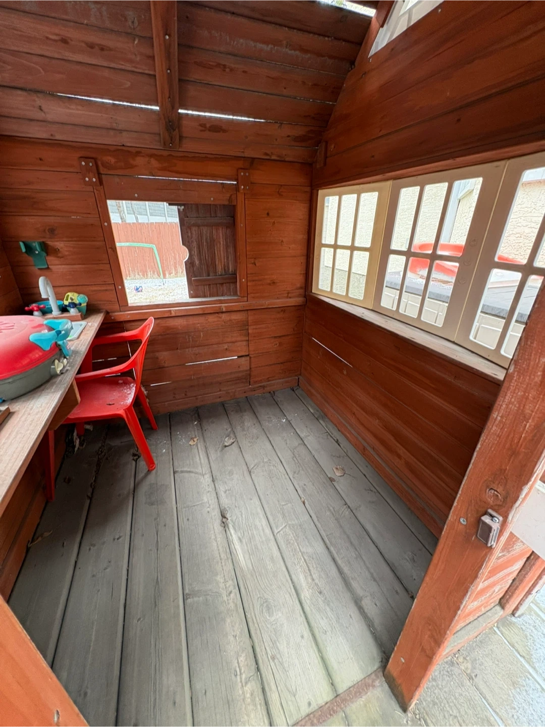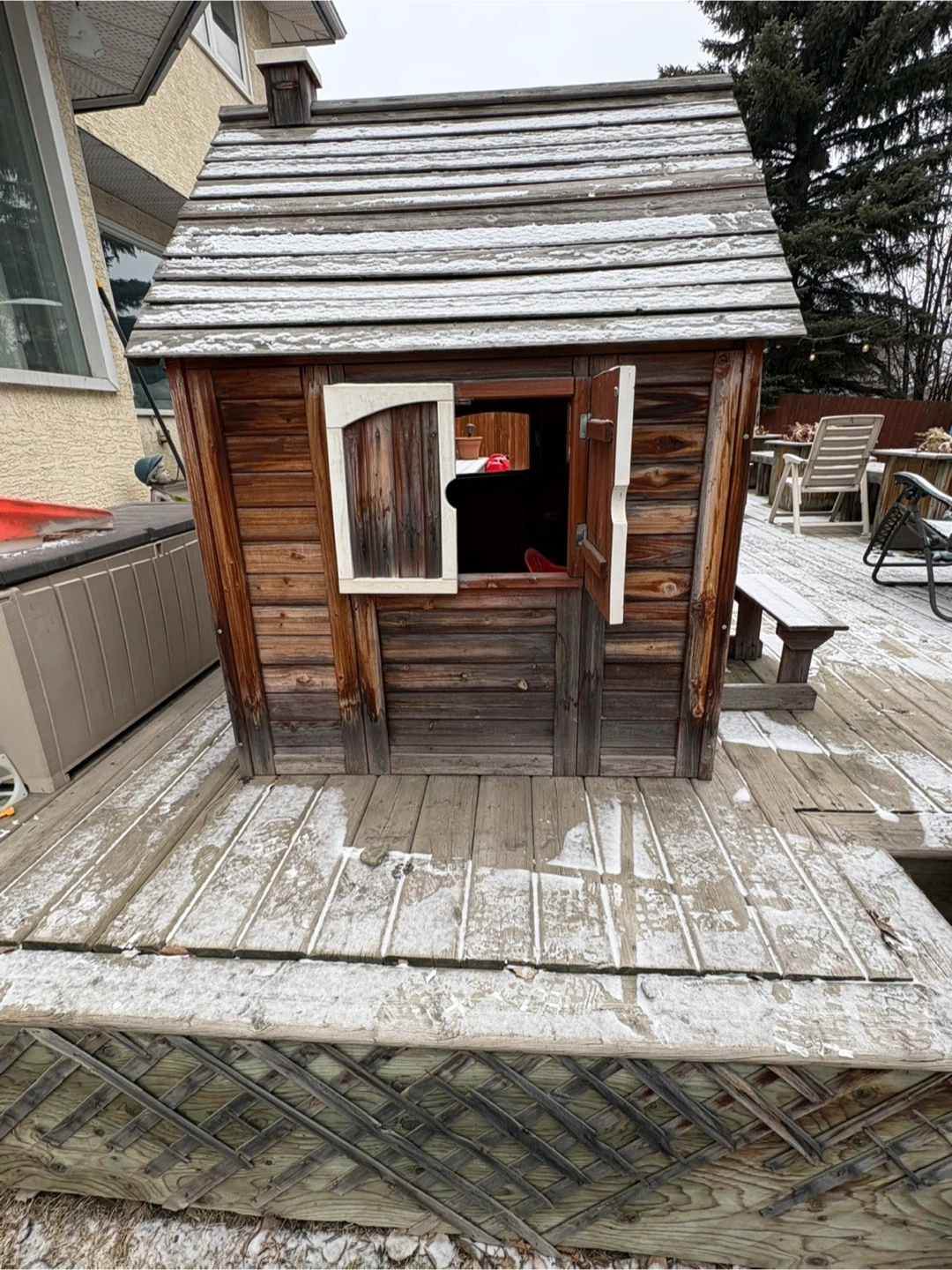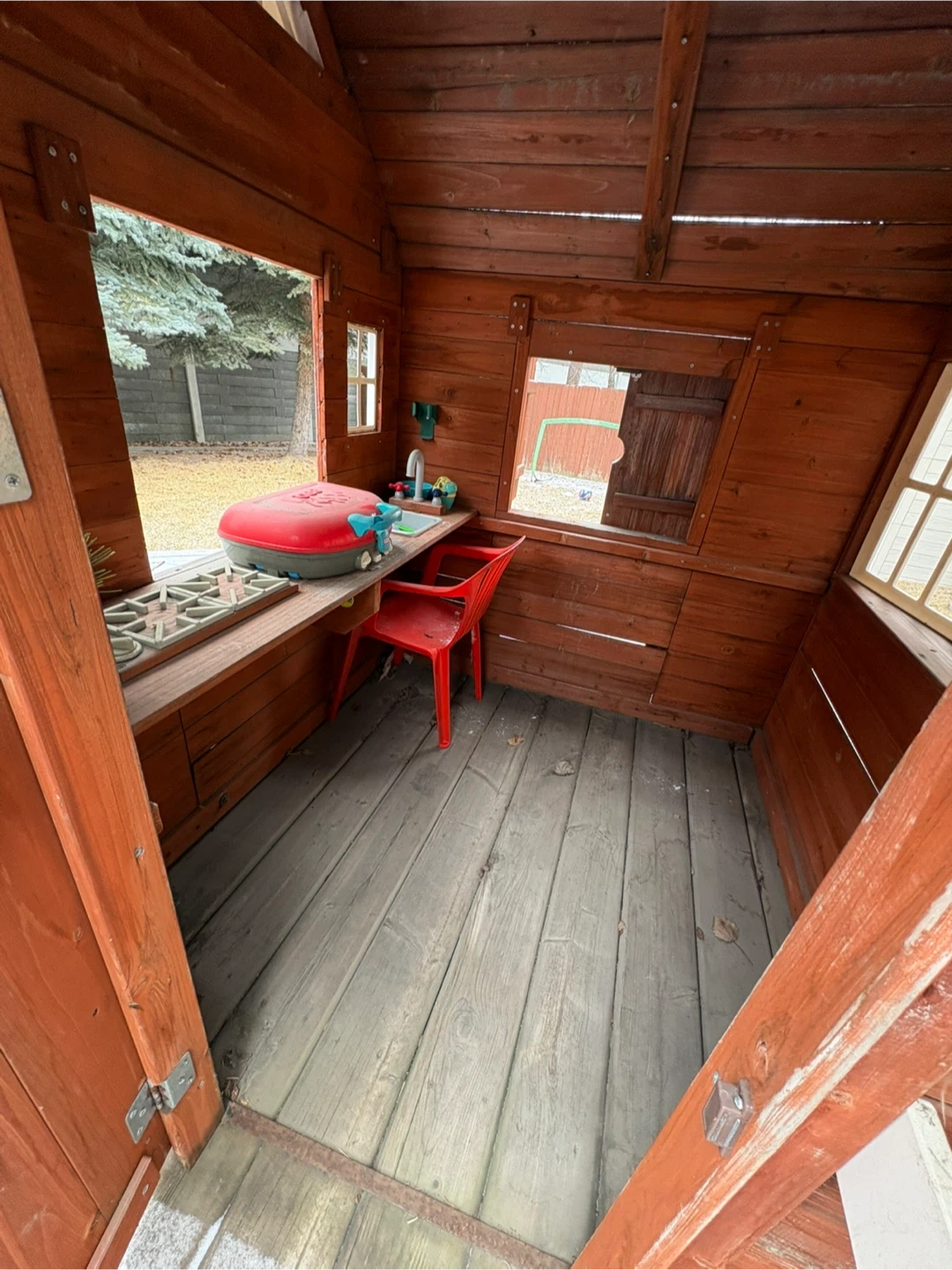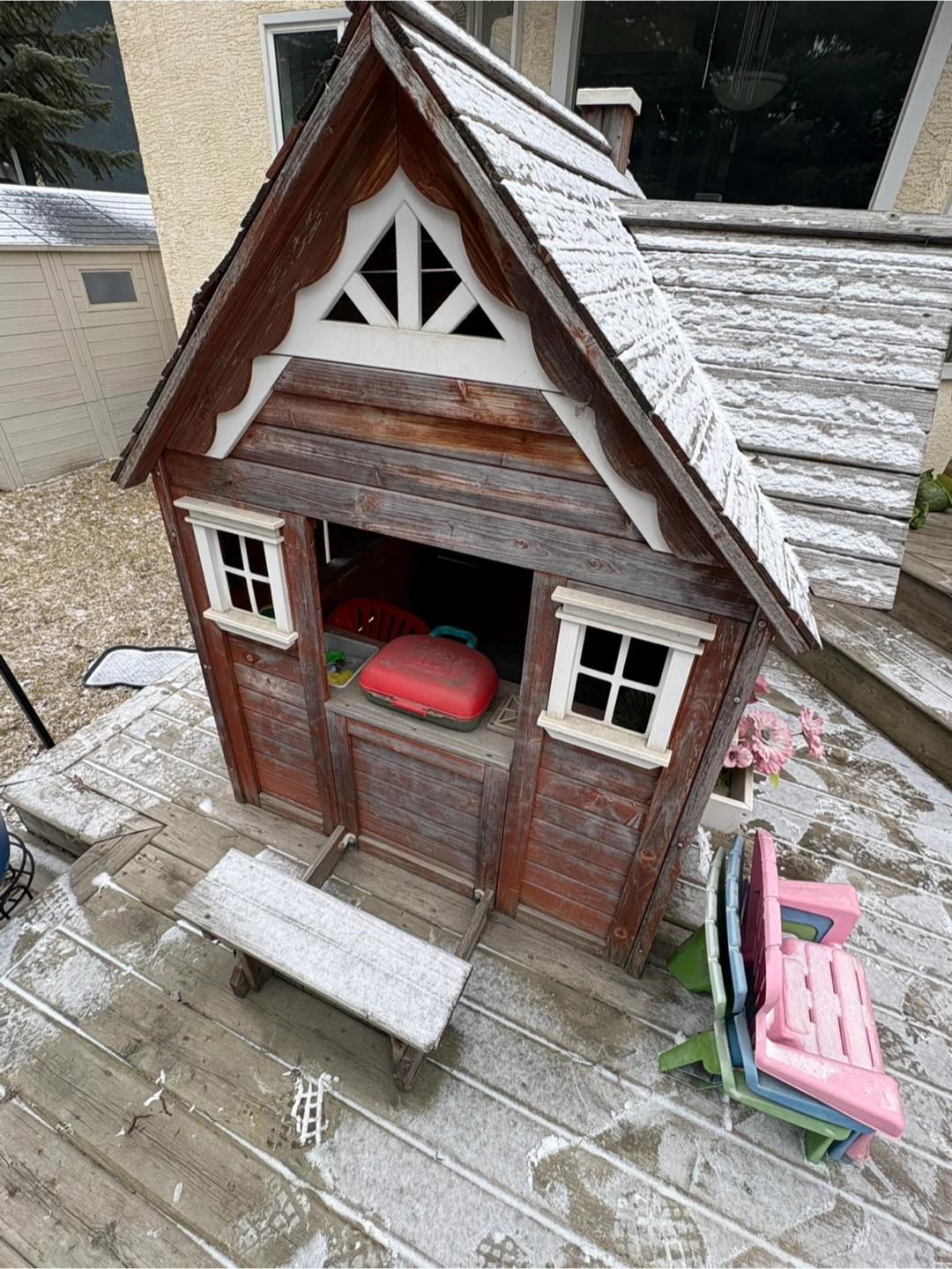 This rustic wooden playhouse is perfect for hours of imaginative fun! It's complete with a play kitchen,bbq, flowers, electric doorbell, pink, blue and green chairs and bench. Kids will love this charming addition to their backyard! A couple boards will need to be re-secured and new batteries for the electronic doorbell. A coat of paint would make it brand new again.