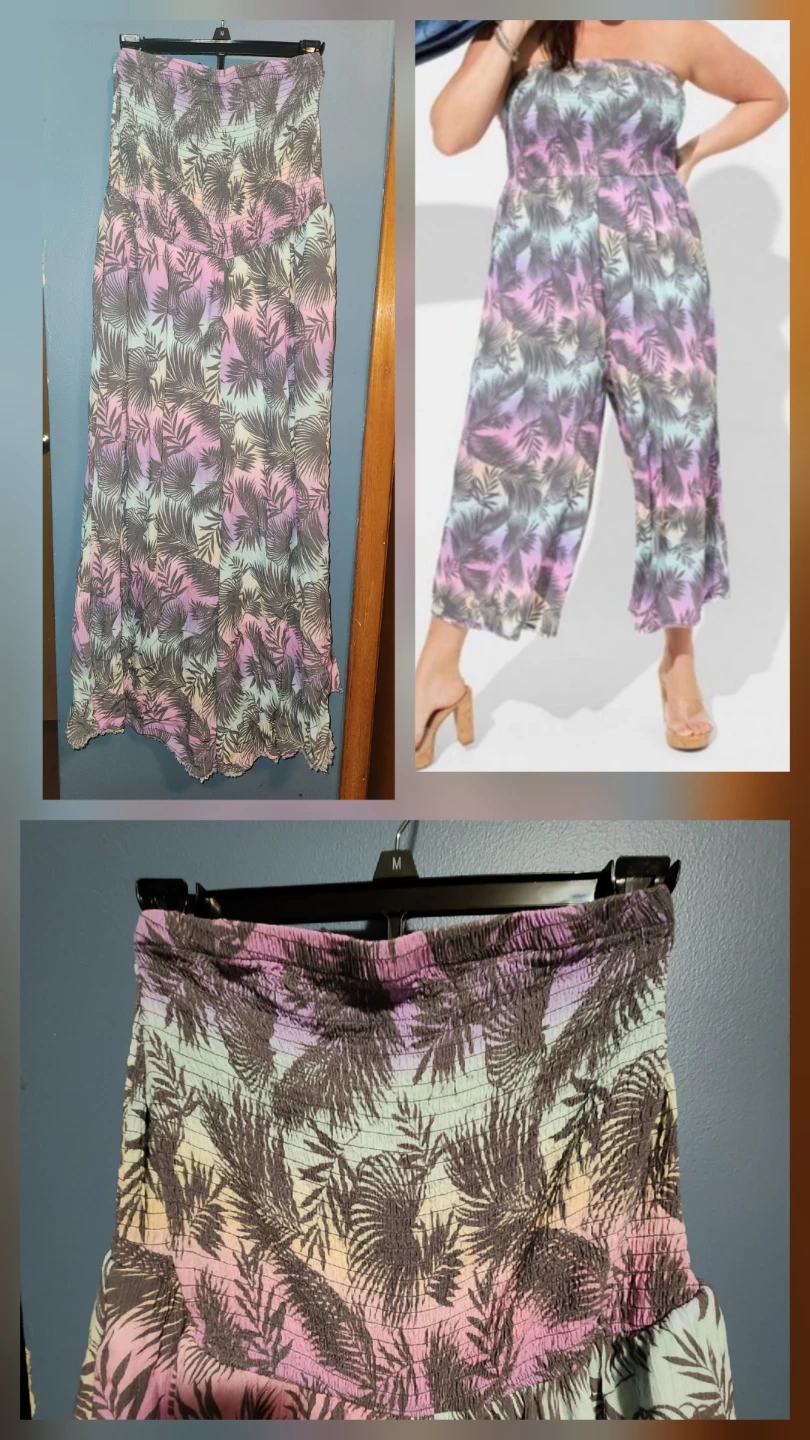 This Torrid strapless maxi dress features a vibrant palm leaf print. It's a size 2 with a smocked bodice for a comfortable fit. The pastel colour palette makes it perfect for warm weather occasions!